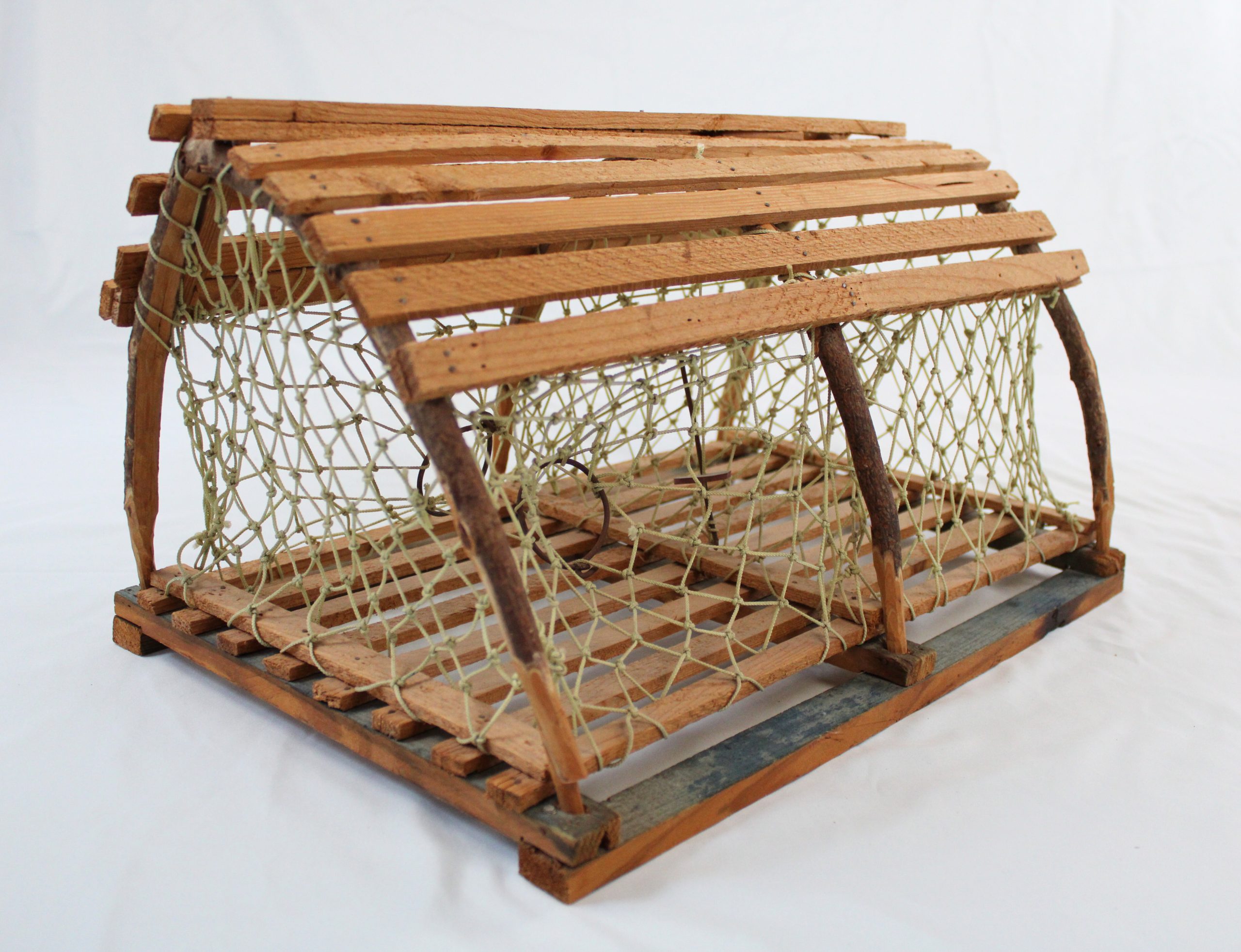 A miniature model lobster trap constructed in the traditional arched “D-shape” style.