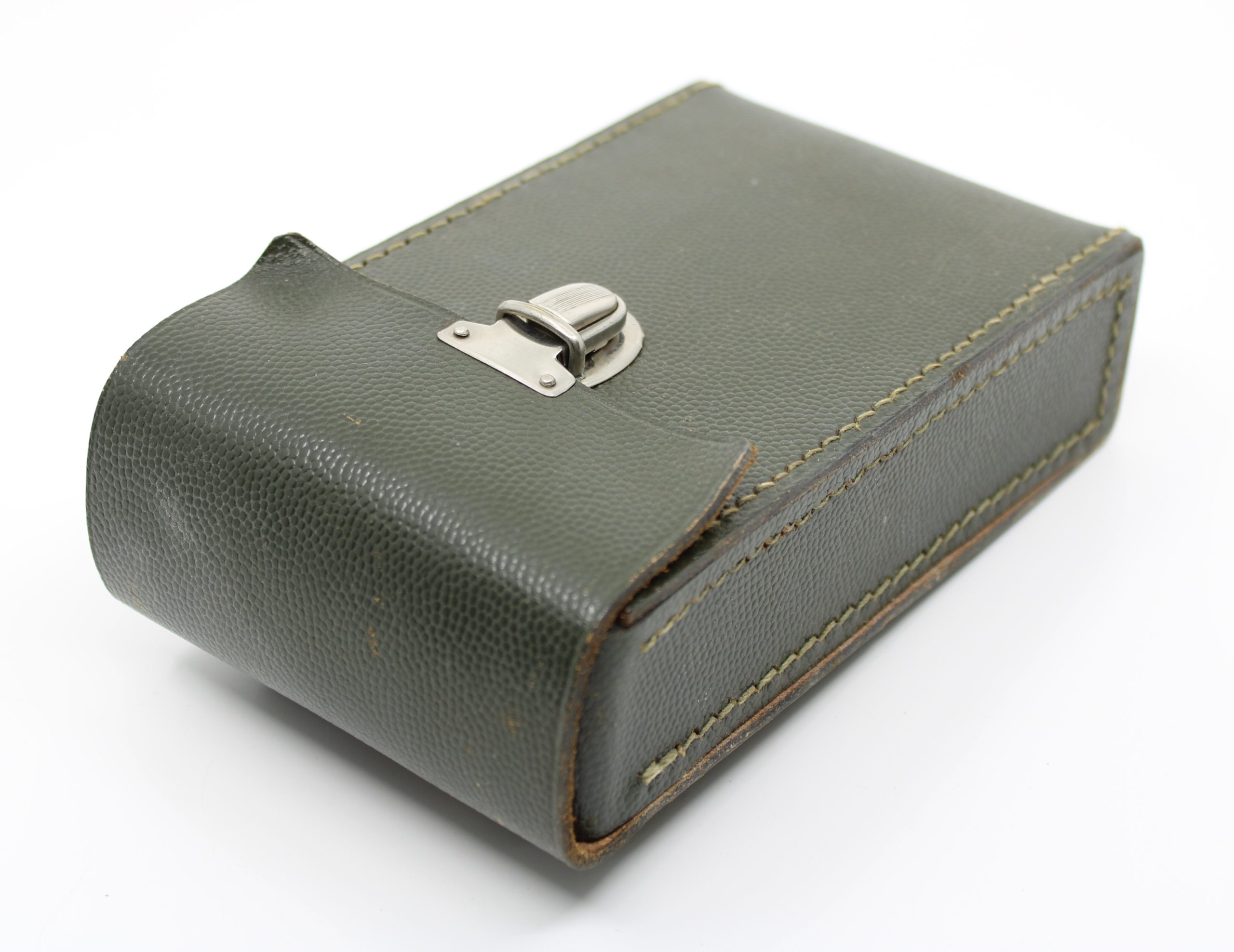Compact green leatherette case with metal clasp closure, rectangular shape with rounded flap edge. The case opens to reveal a series of small electric