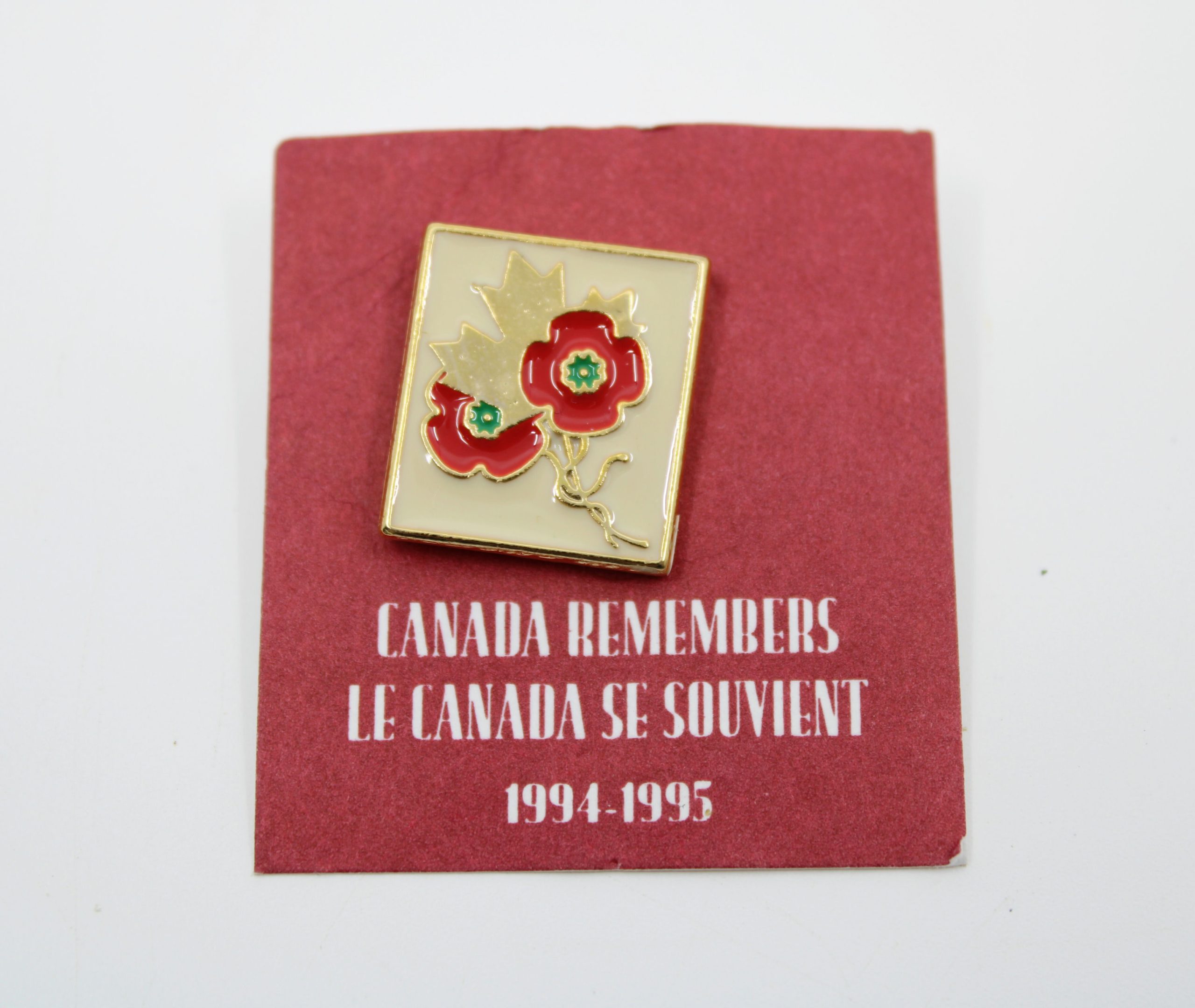 Square metal and enamel lapel pin mounted on its original commemorative backing card. The pin features two red poppies set against a gold maple leaf,