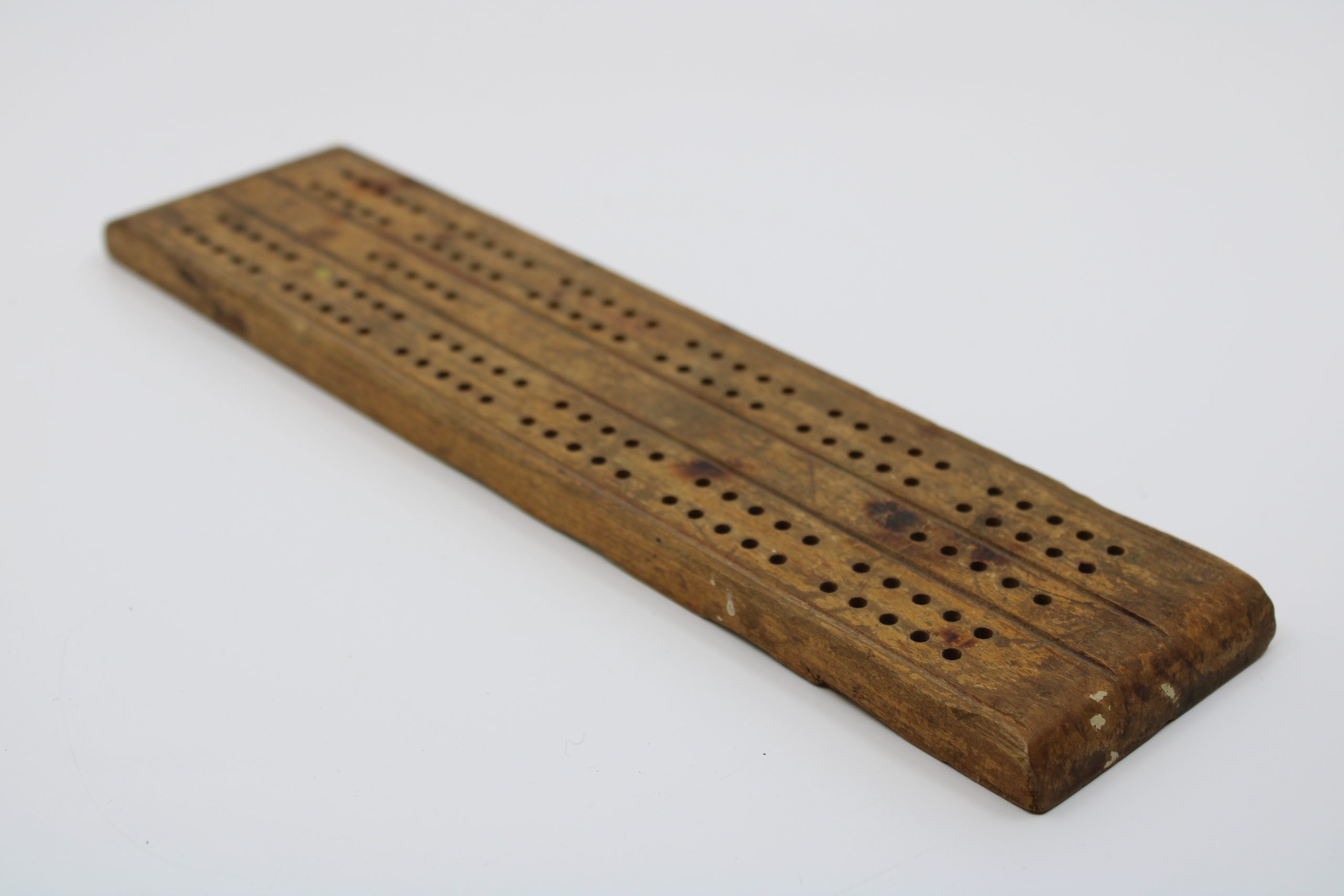A rectangular wooden cribbage board with three parallel rows of evenly spaced scoring holes, hand-drilled into the surface. The board shows signs of w