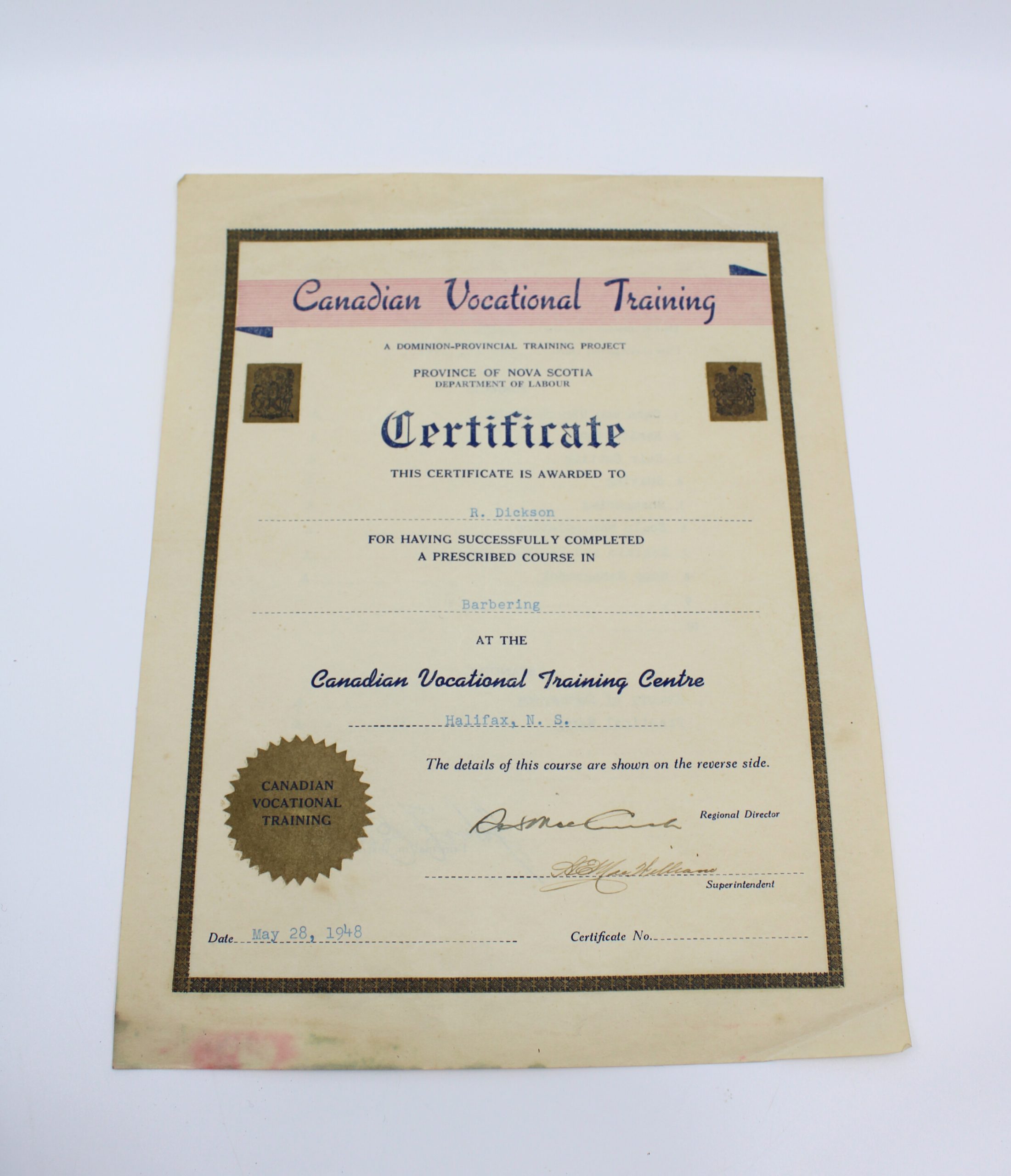 A printed certificate on cream-colored paper issued by the Canadian Vocational Training Centre in Halifax, Nova Scotia. The certificate recognizes R.