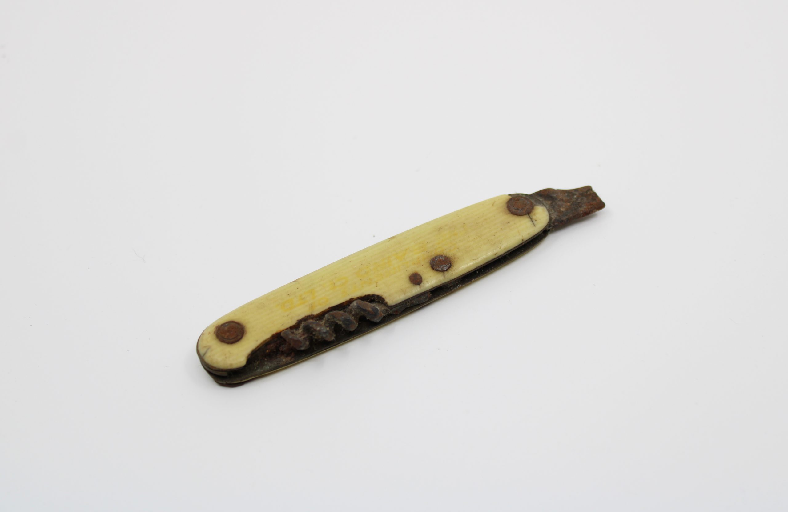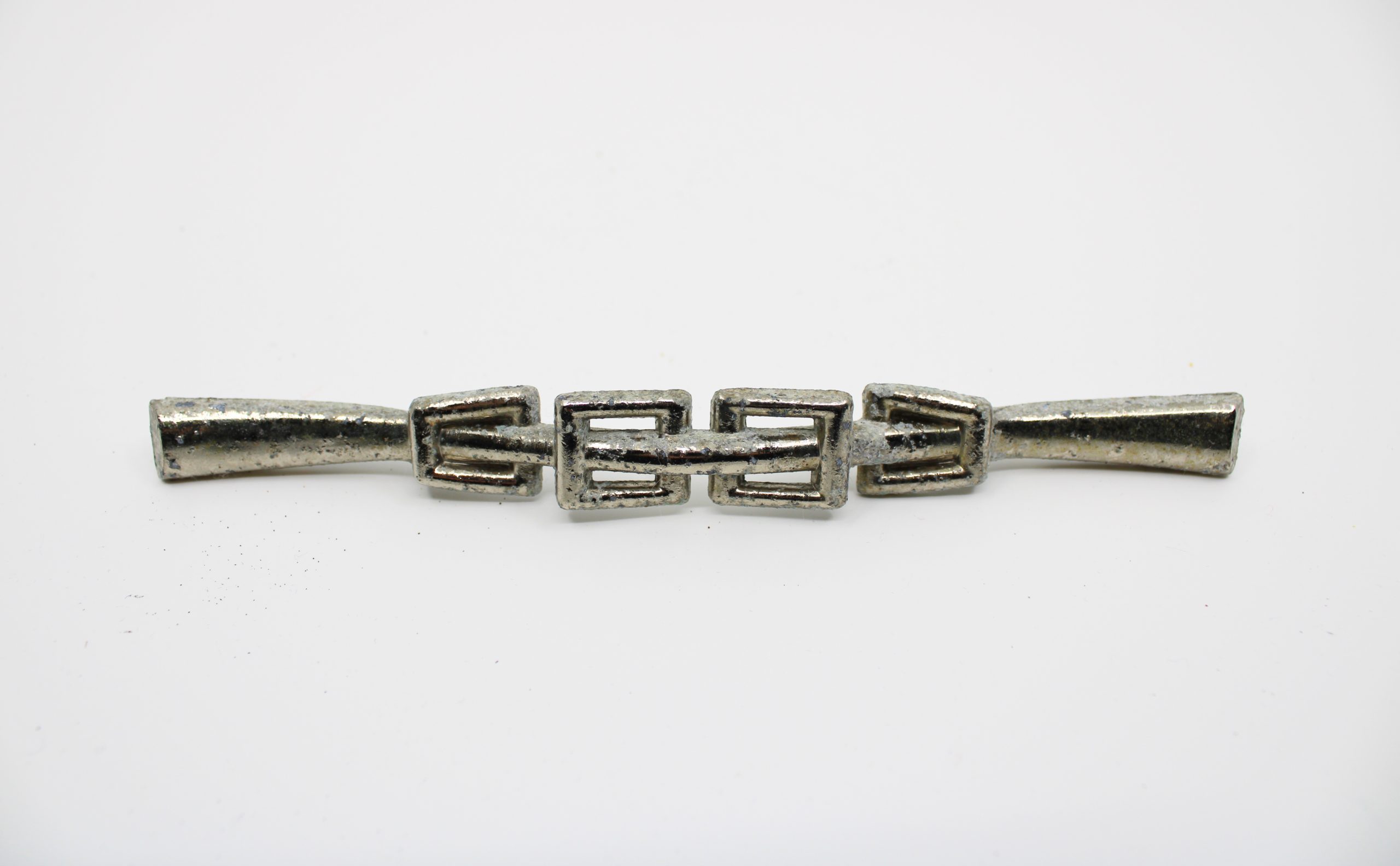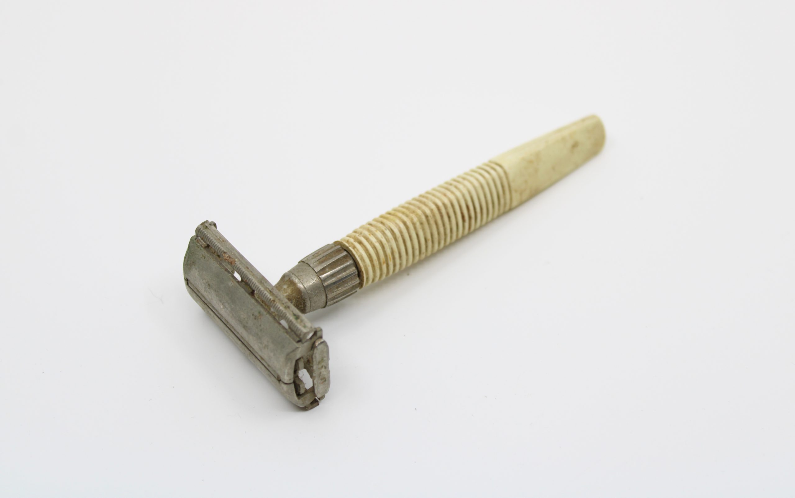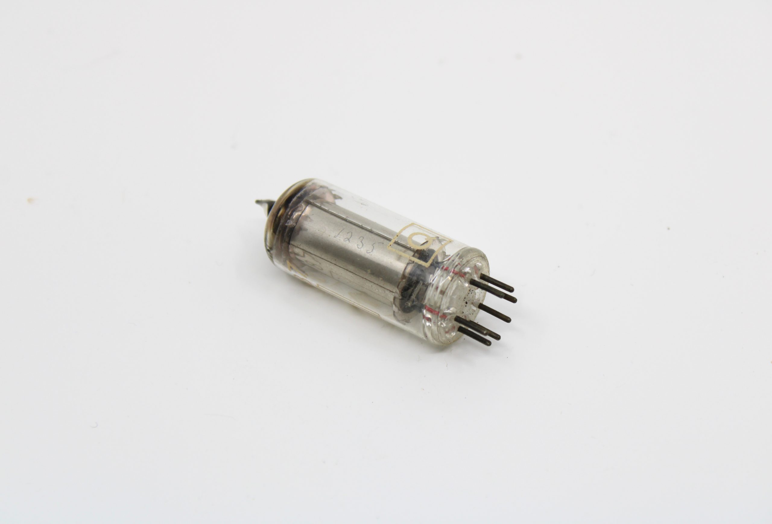 Cylindrical miniature radio vacuum tube made of clear glass with a visible internal electrode assembly and five protruding metal pins at the base. The