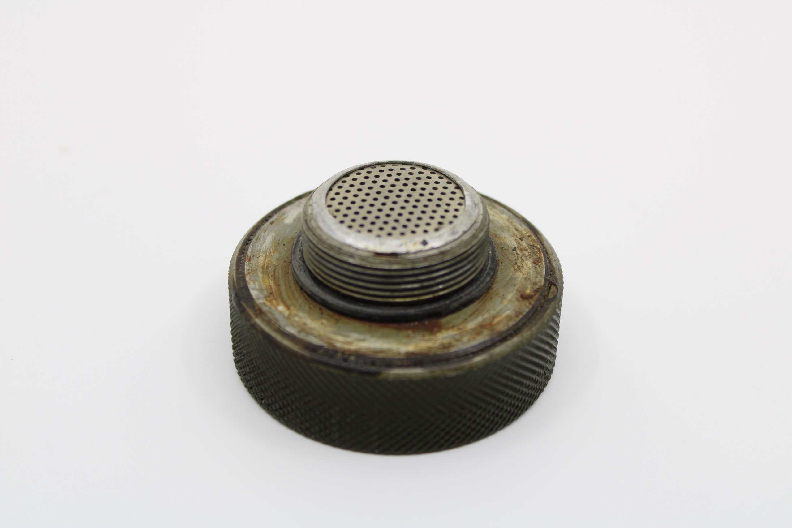Circular metal microphone capsule consisting of a perforated front grill and threaded metal casing with a textured lower section for grip. The top sur