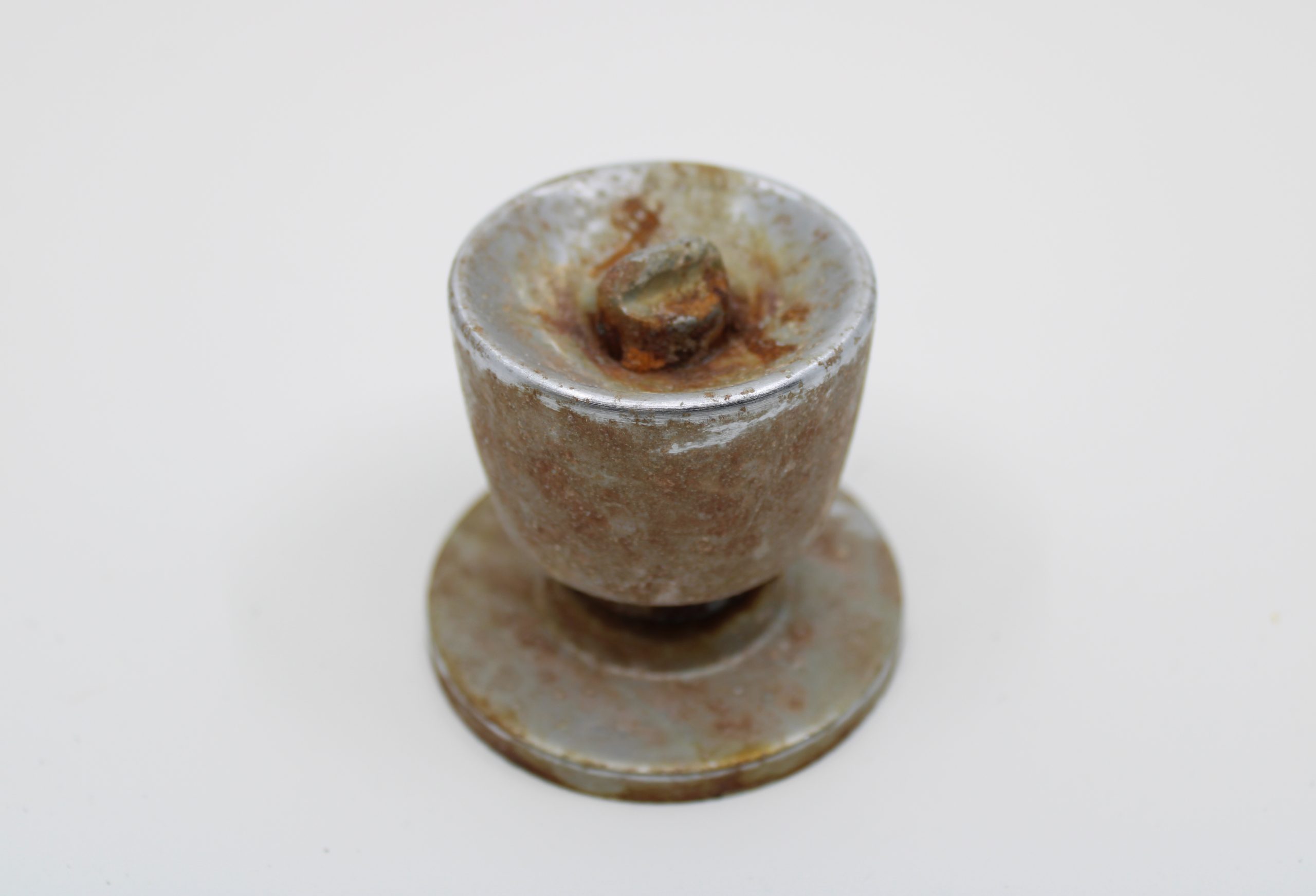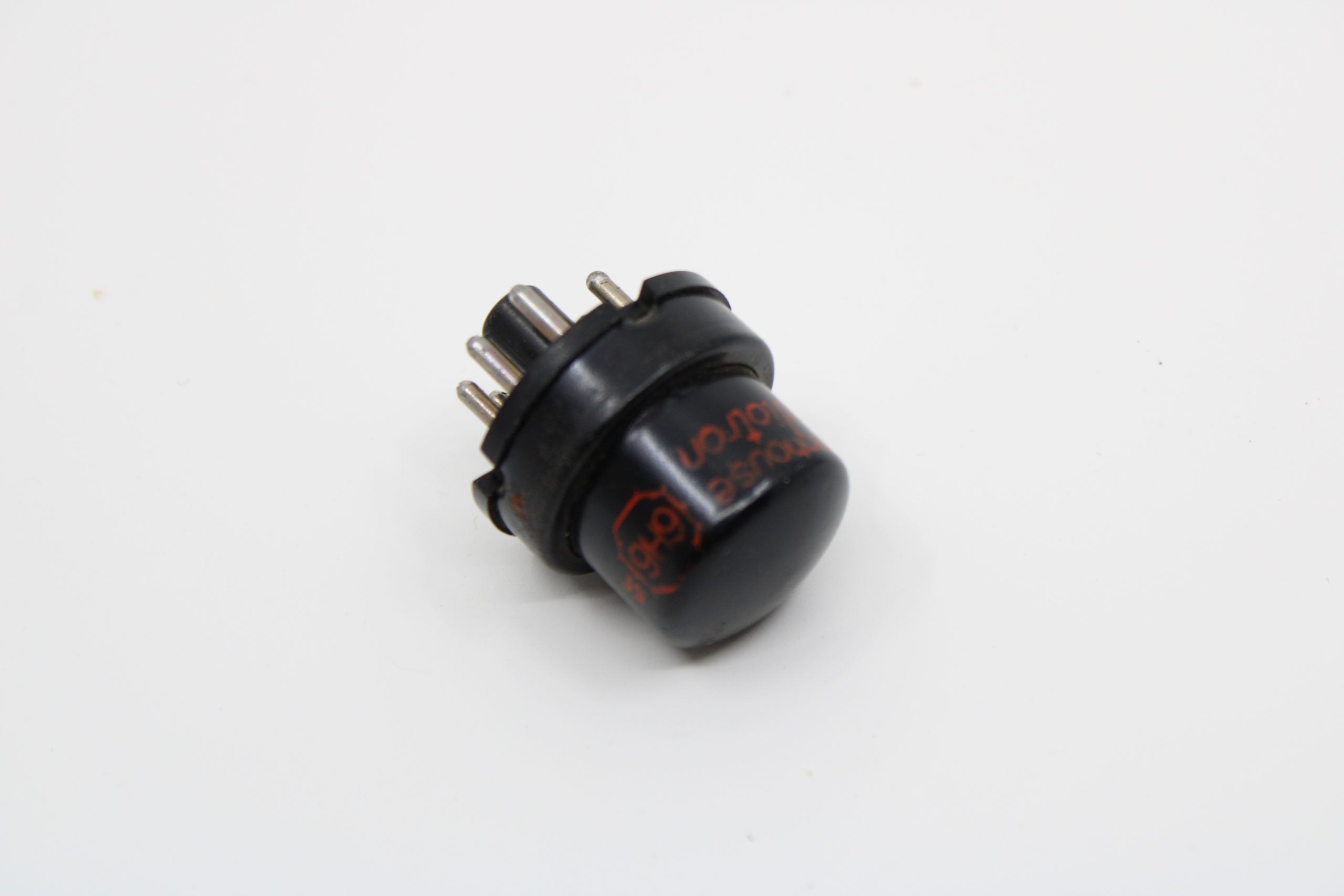 Small black bakelite radio valve (vacuum tube) component with six metal pins and cylindrical housing. The exterior bears the Westinghouse Radiotron lo
