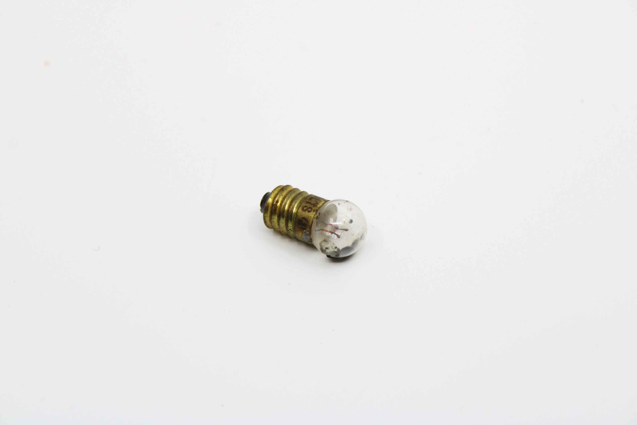 Small miniature incandescent light bulb with clear glass dome and threaded brass base. The bulb contains a visible tungsten filament and traces of sil