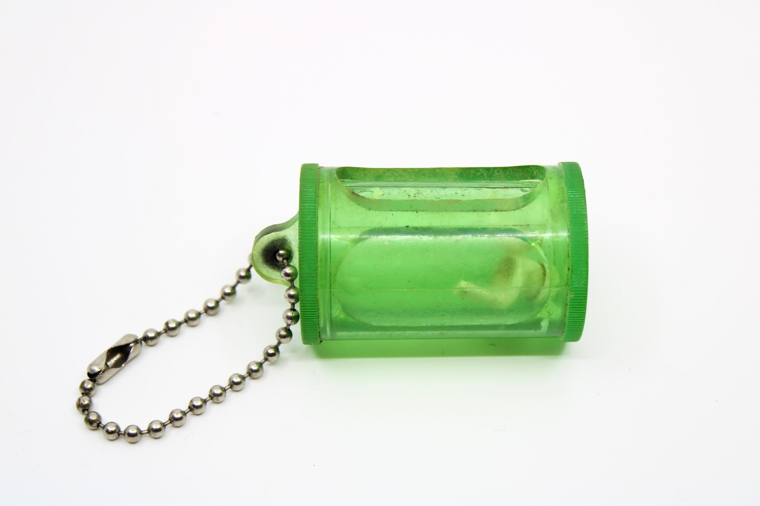 Small green translucent plastic earplug case with a screw-top lid and a metal bead chain for attachment to other survival or field gear. The case cont