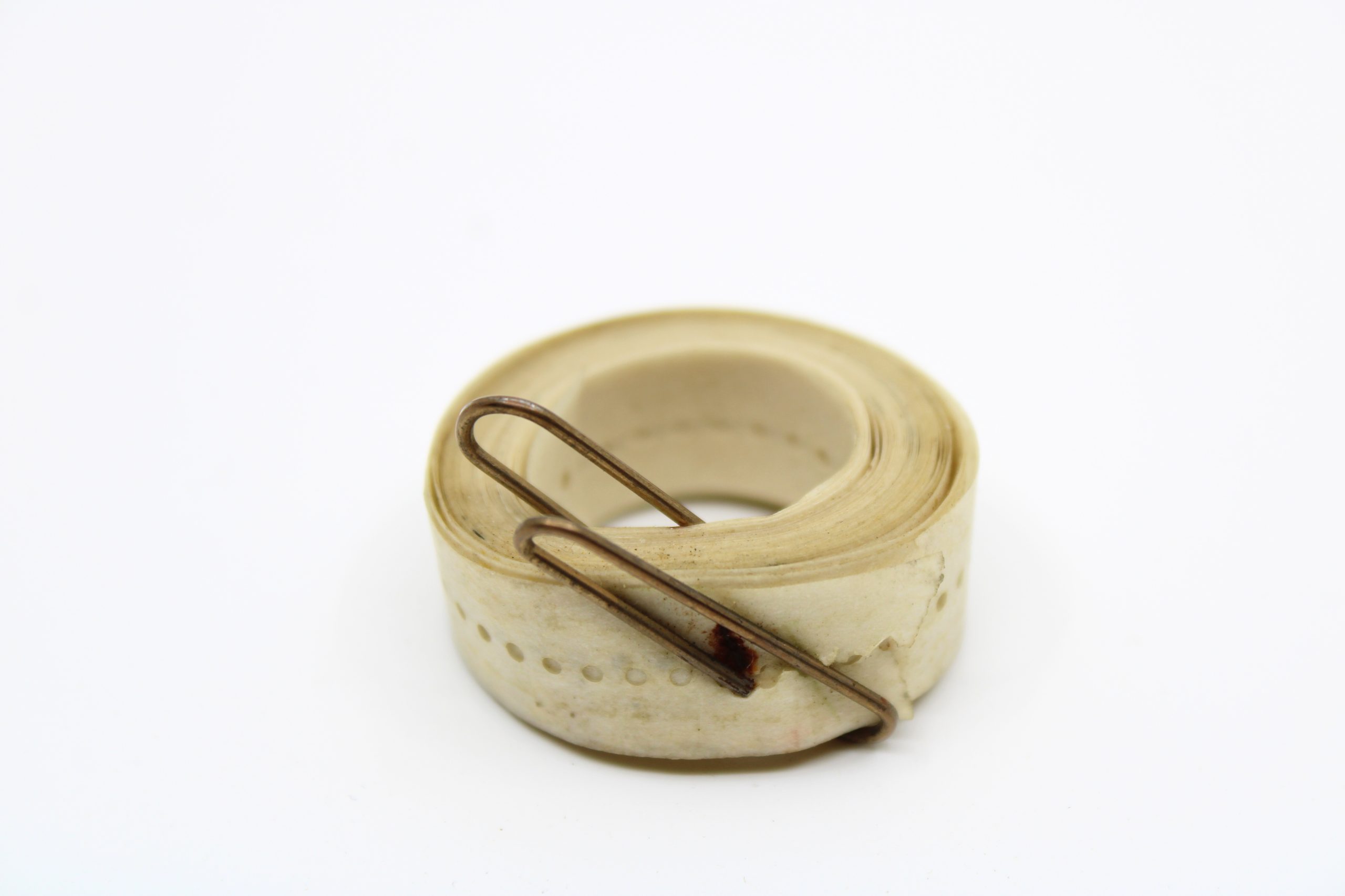 Small roll of white perforated medical adhesive tape, held together by a rusted metal paper clip. Likely issued as part of an individual aircrew survi
