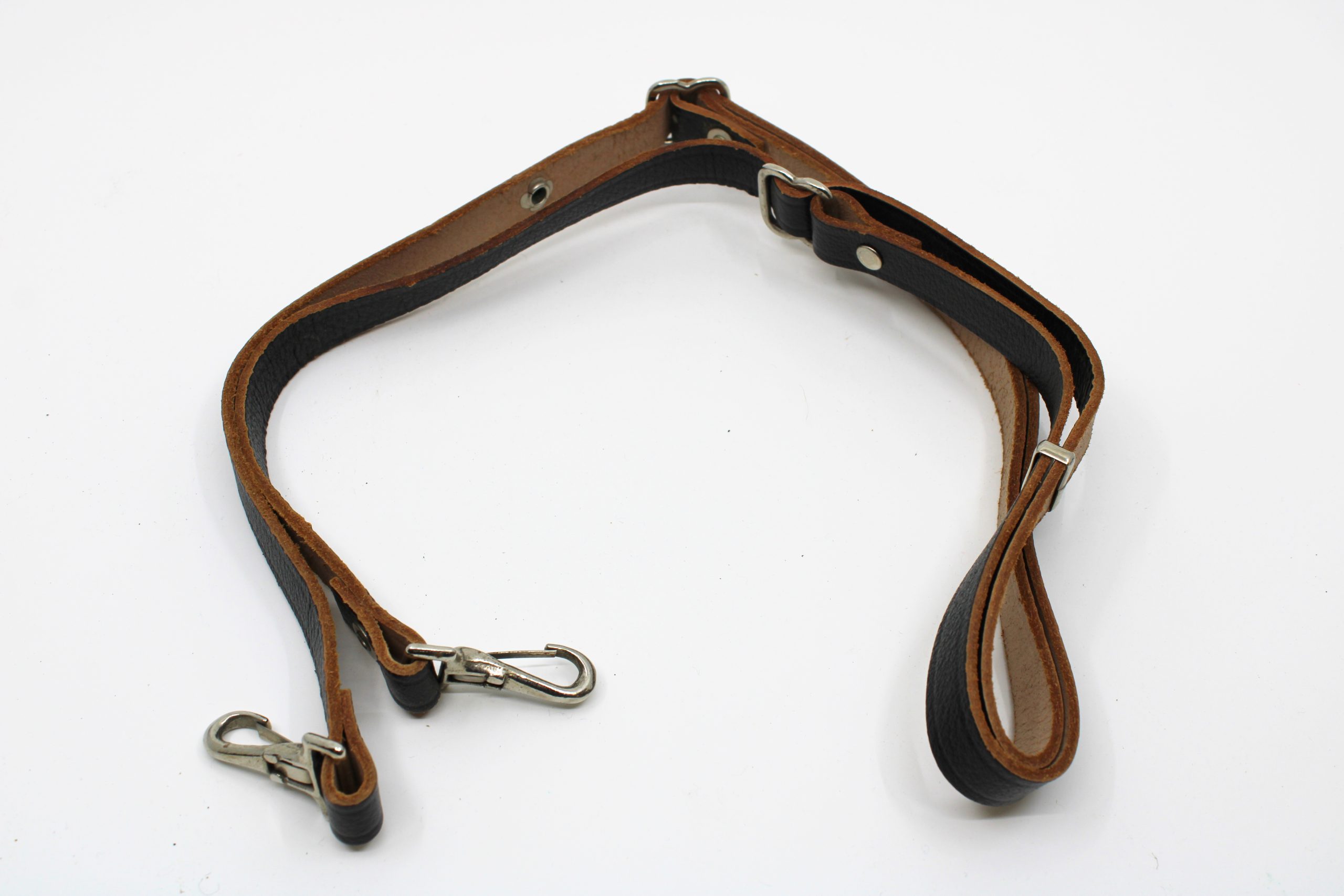 Adjustable brown-and-black leather carrying strap with two metal swivel hooks at each end and riveted metal fittings. The strap is made of sturdy, sti