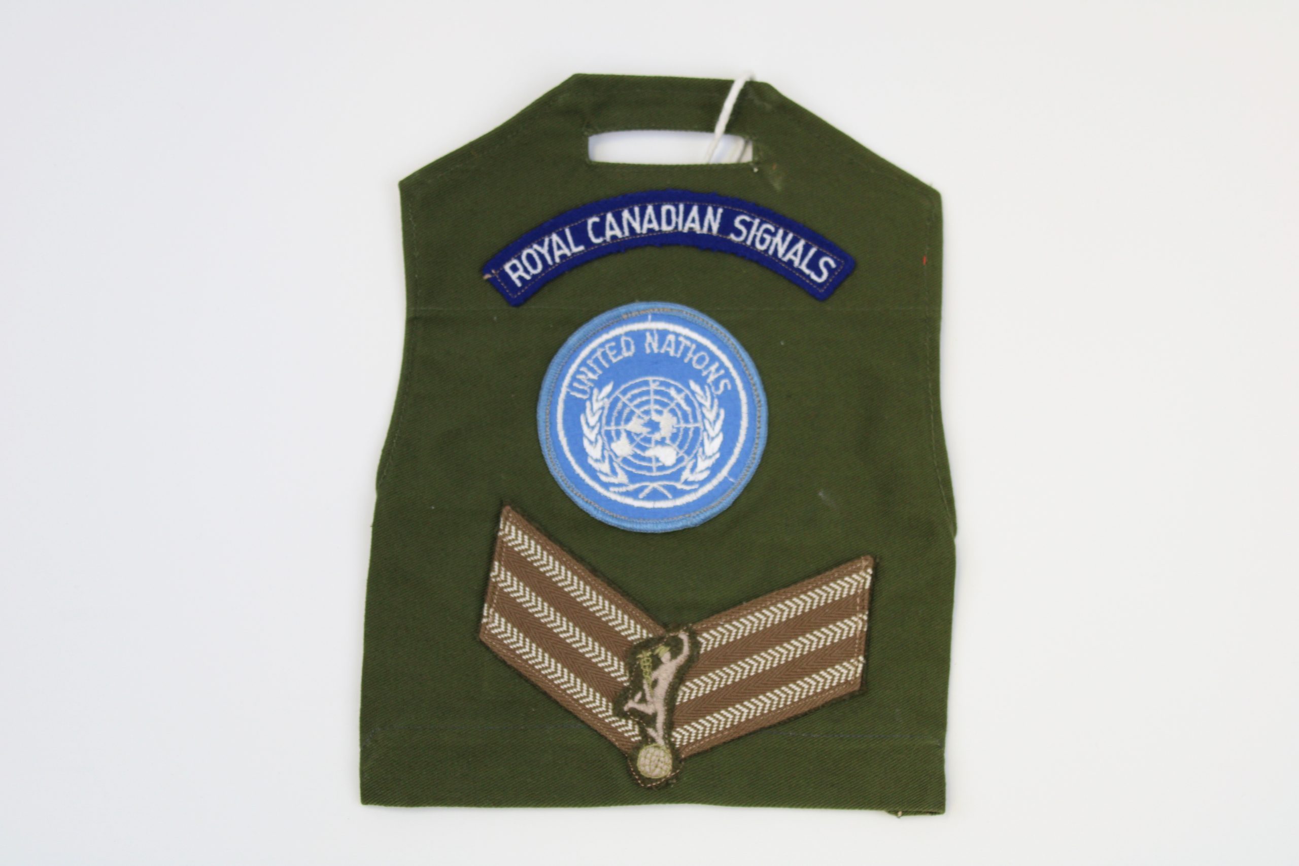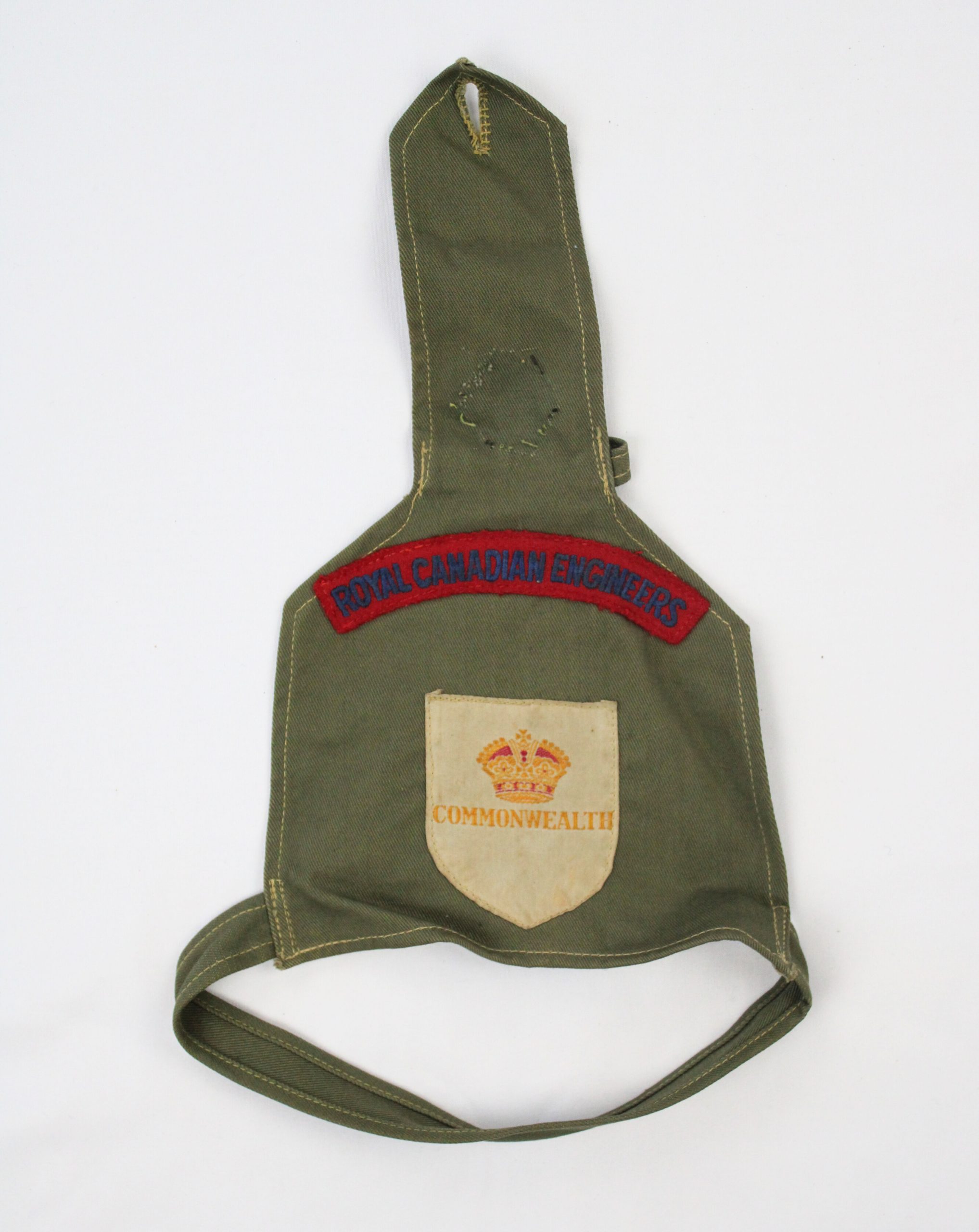 A Commonwealth military sleeve insignia mounted on khaki cotton fabric with a rectangular shoulder tab slot for attachment. The central cream shield p