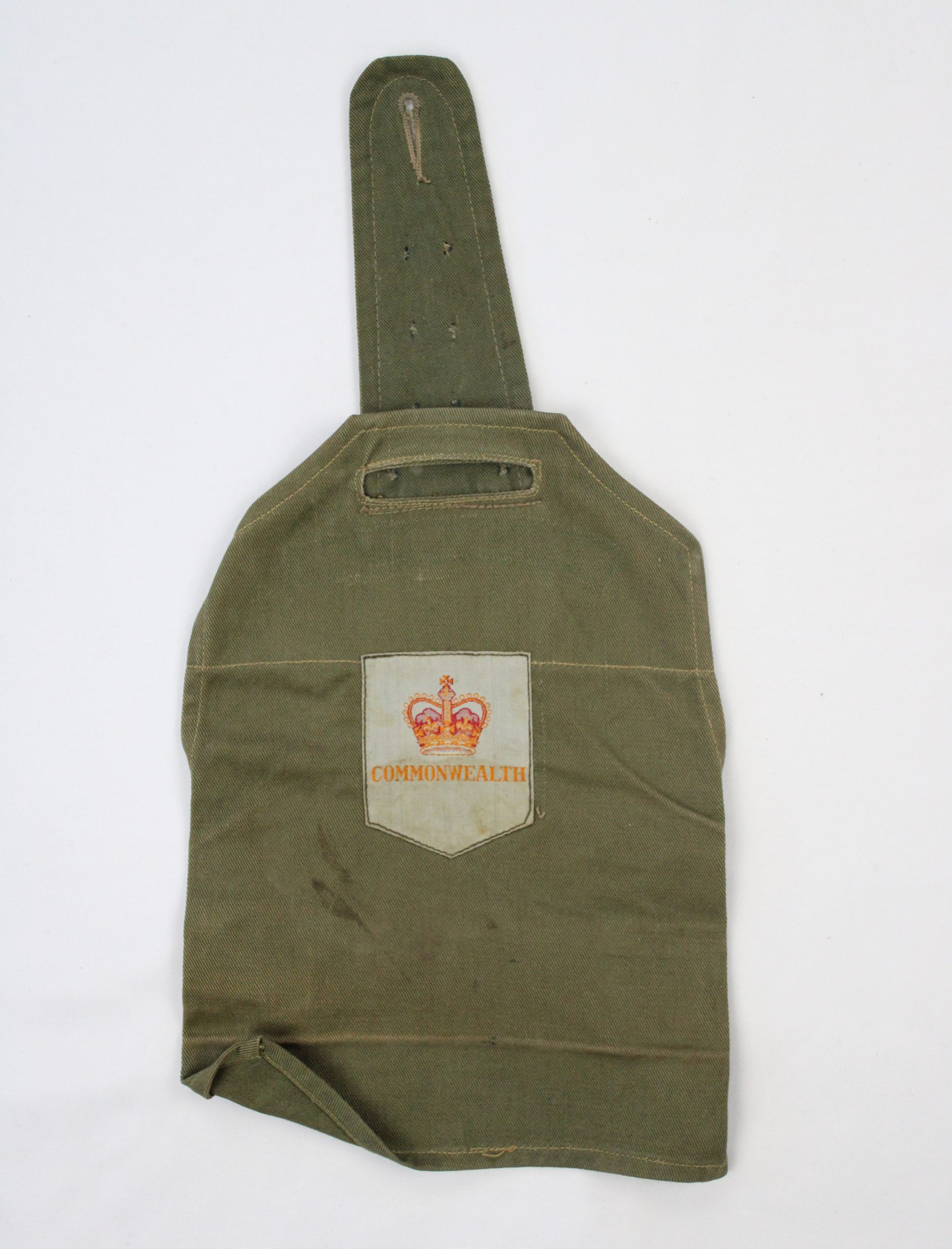 A Commonwealth military sleeve insignia mounted on olive-green uniform fabric with an extended tab and buttonhole for attachment. The central cream sh