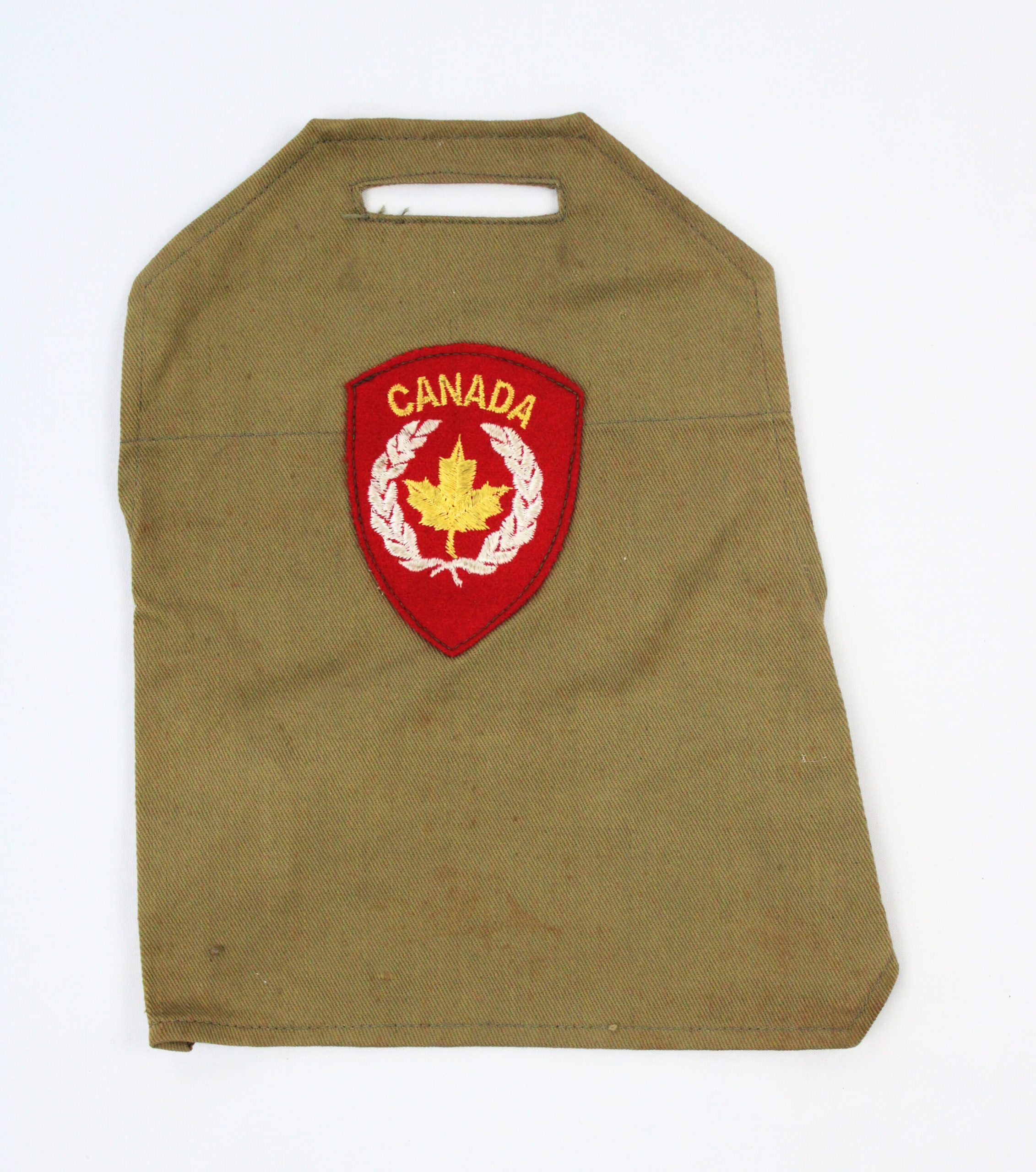 A Canadian military sleeve insignia mounted on khaki cotton fabric with a rectangular shoulder slot for uniform attachment. The central red shield pat
