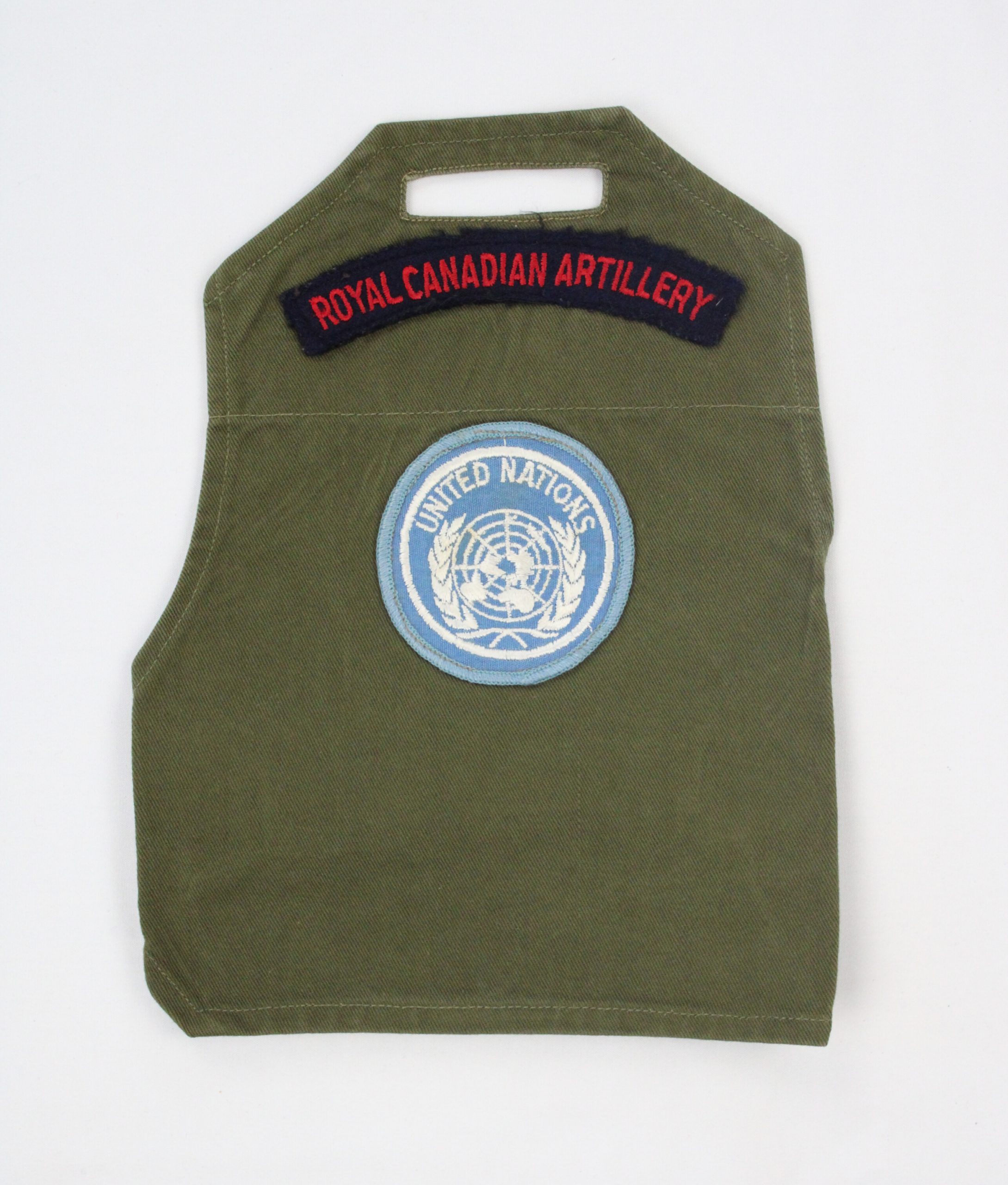 A Royal Canadian Artillery sleeve insignia mounted on olive-green cotton uniform fabric with a rectangular slot at the top for shoulder attachment. Th