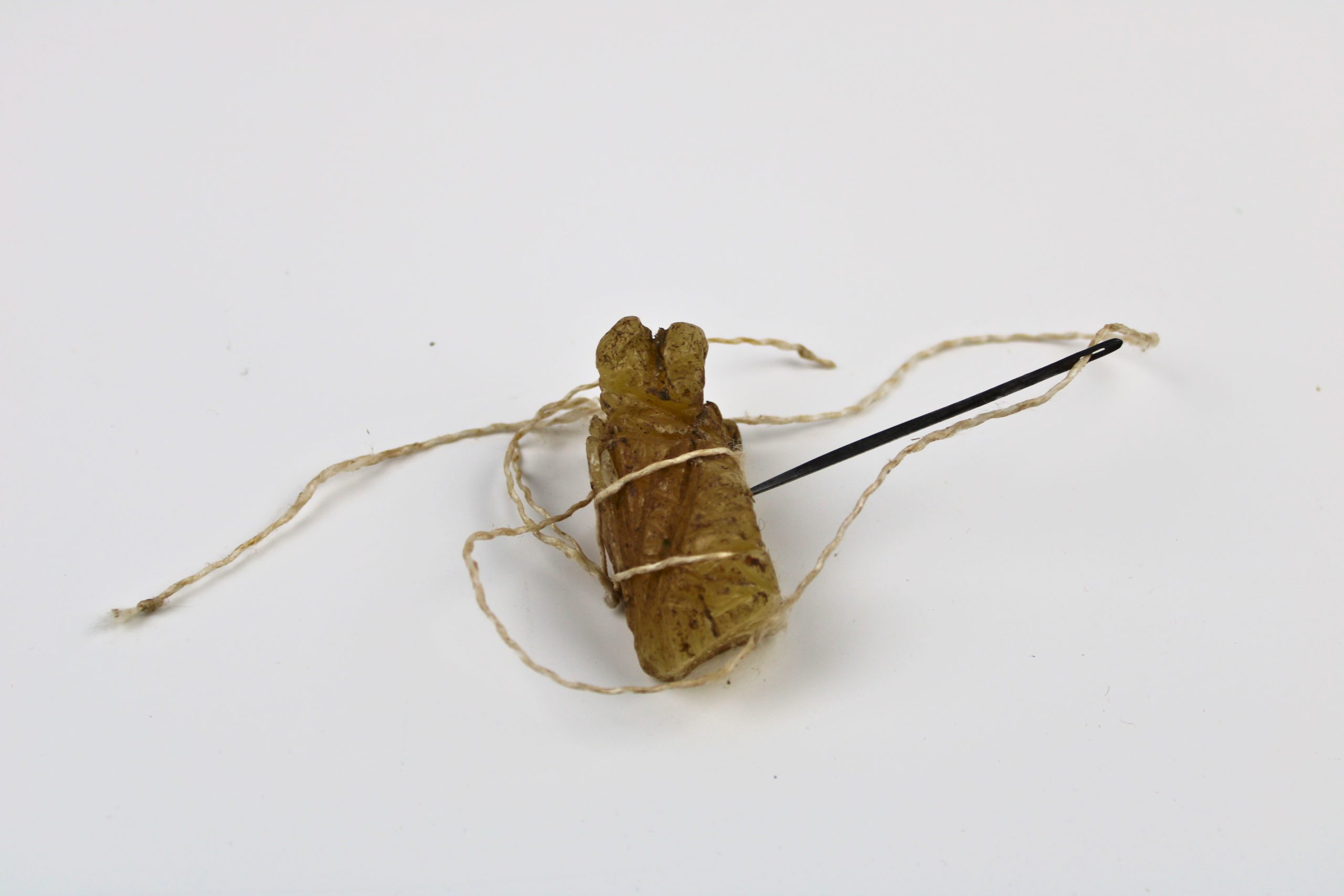 A small, amber-colored block of beeswax with thread and a metal needle inserted through it. The thread is wrapped loosely around the wax block for sto