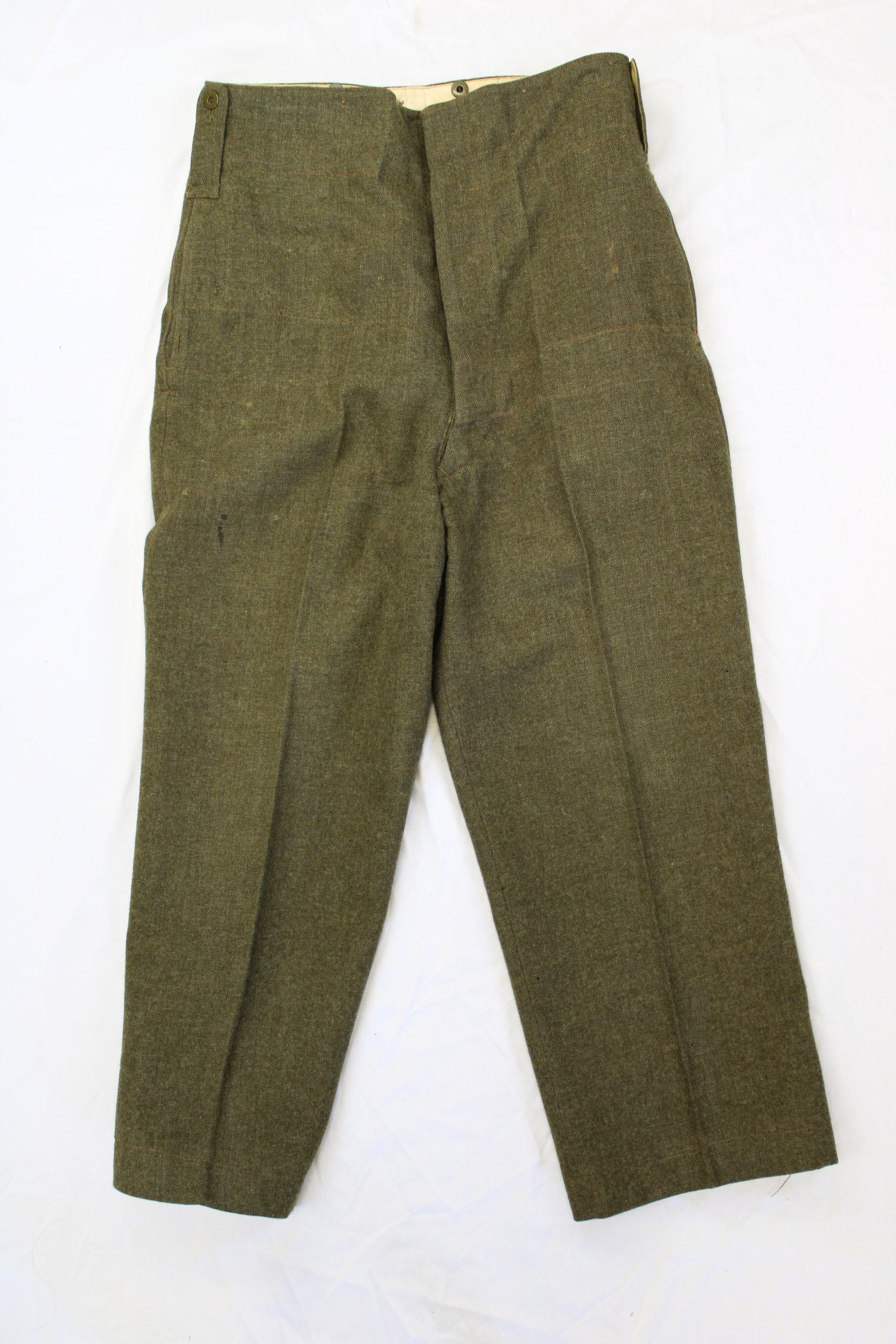 Olive-green wool uniform trousers belonging to Franklin Howard McColm, member of the Royal Rifles of Canada during the Second World War. The pants are