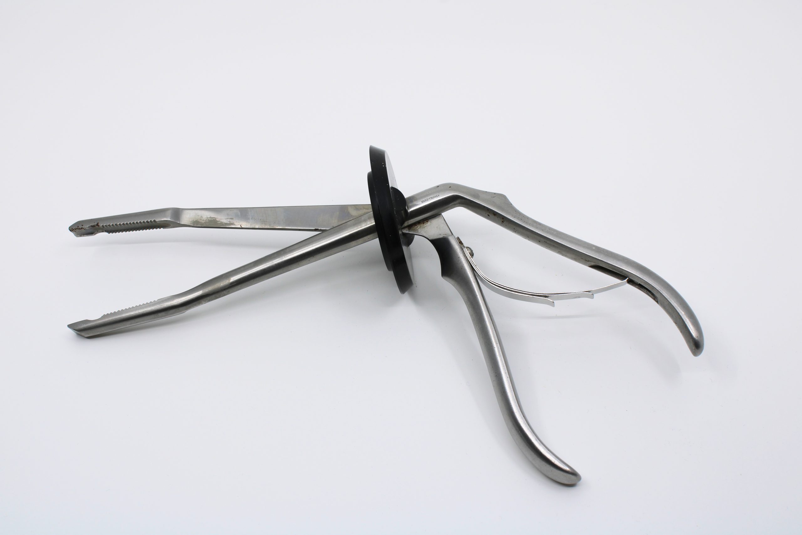 Detachable stainless-steel forceps-style handles with a locking lever. Part of a 2-piece set. When assembled, the handles control the internal piston