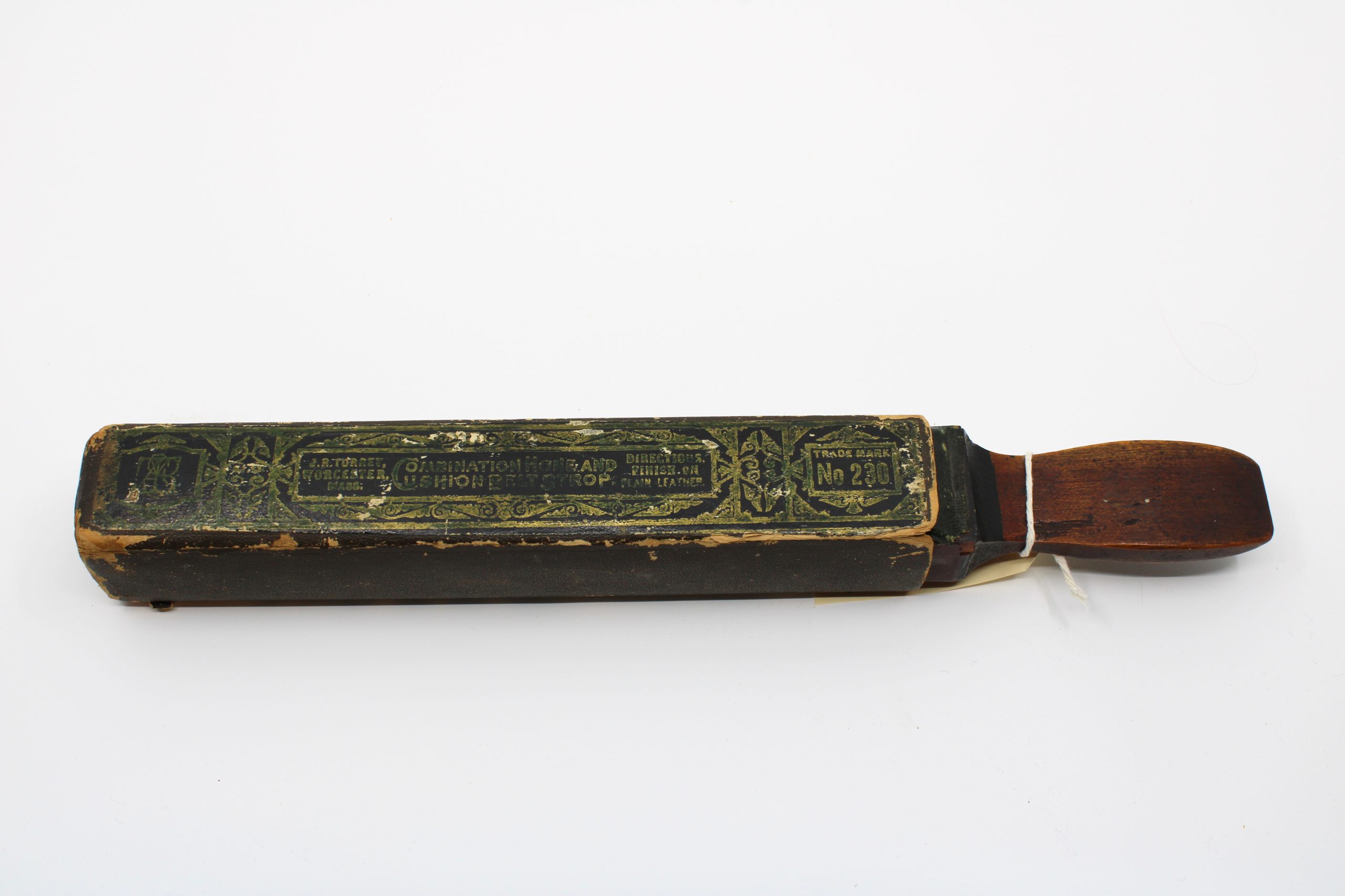 Rectangular cardboard storage box for the J.R. Torrey Combination Hone and Cushion Razor Strop No. 230. The exterior is covered in black paper with go