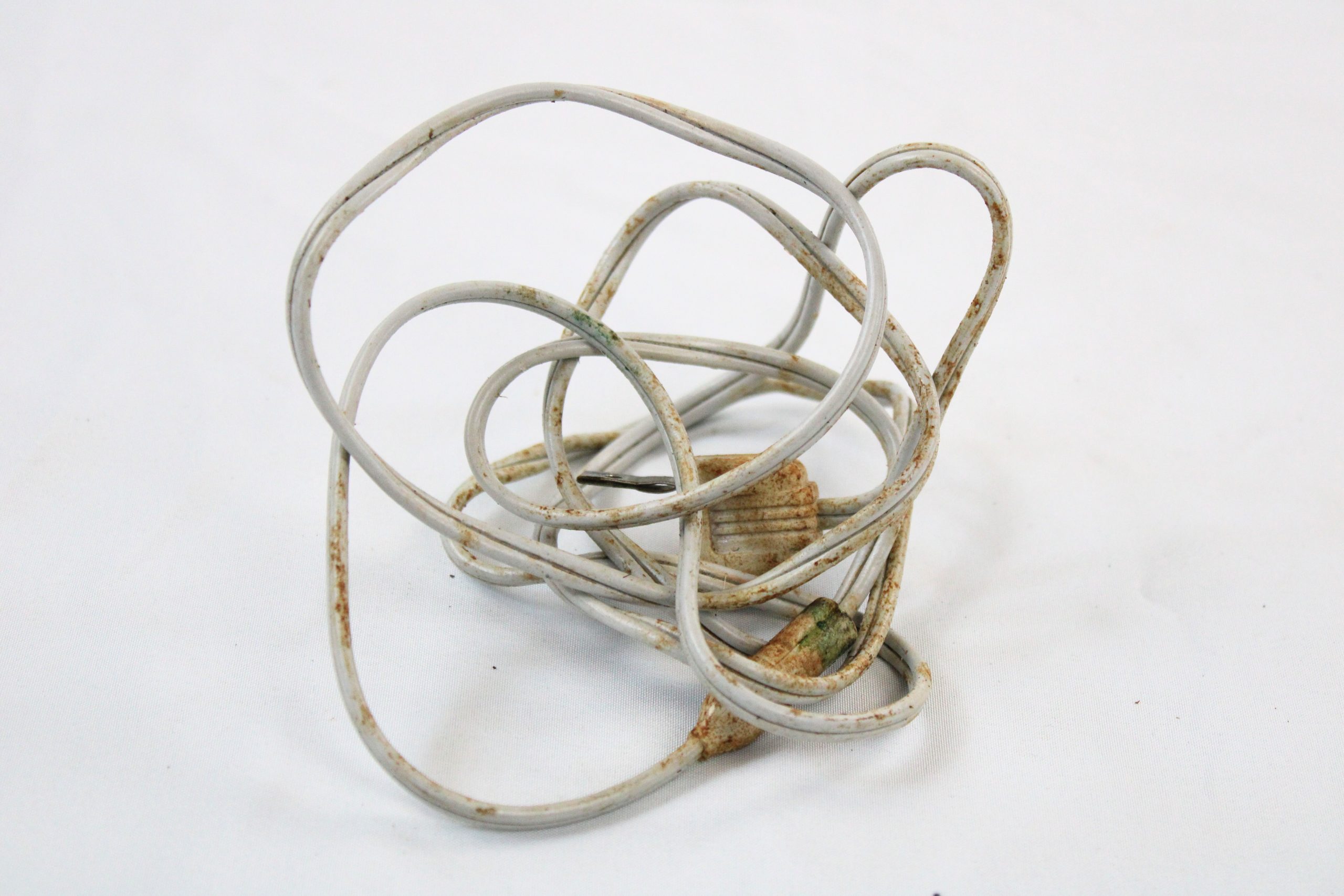 A grey electrical power cord with two-prong plug attachment. The cord is flexible but heavily rusted and discoloured, particularly around the connecto