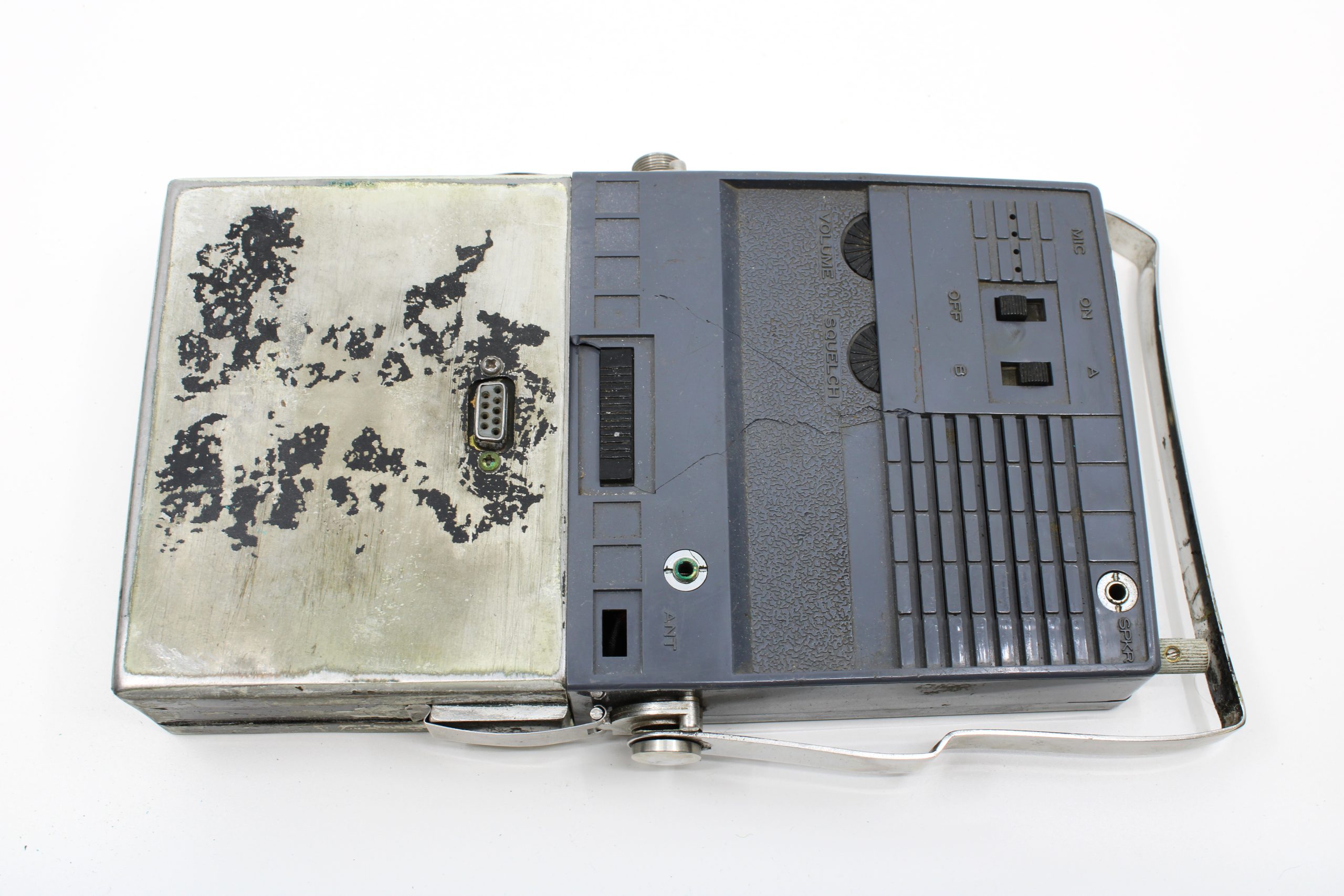 Rectangular portable transmitter-receiver radio encased in a metal and plastic housing with control switches, a volume knob, and multiple input/output