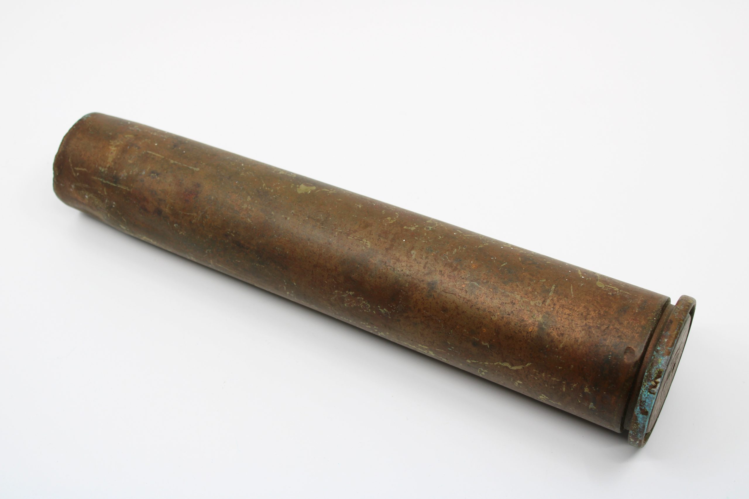 Cylindrical brass shell casing, empty and inert. The base rim is slightly oxidized with traces of blue-green patina typical of aged brass. The body sh