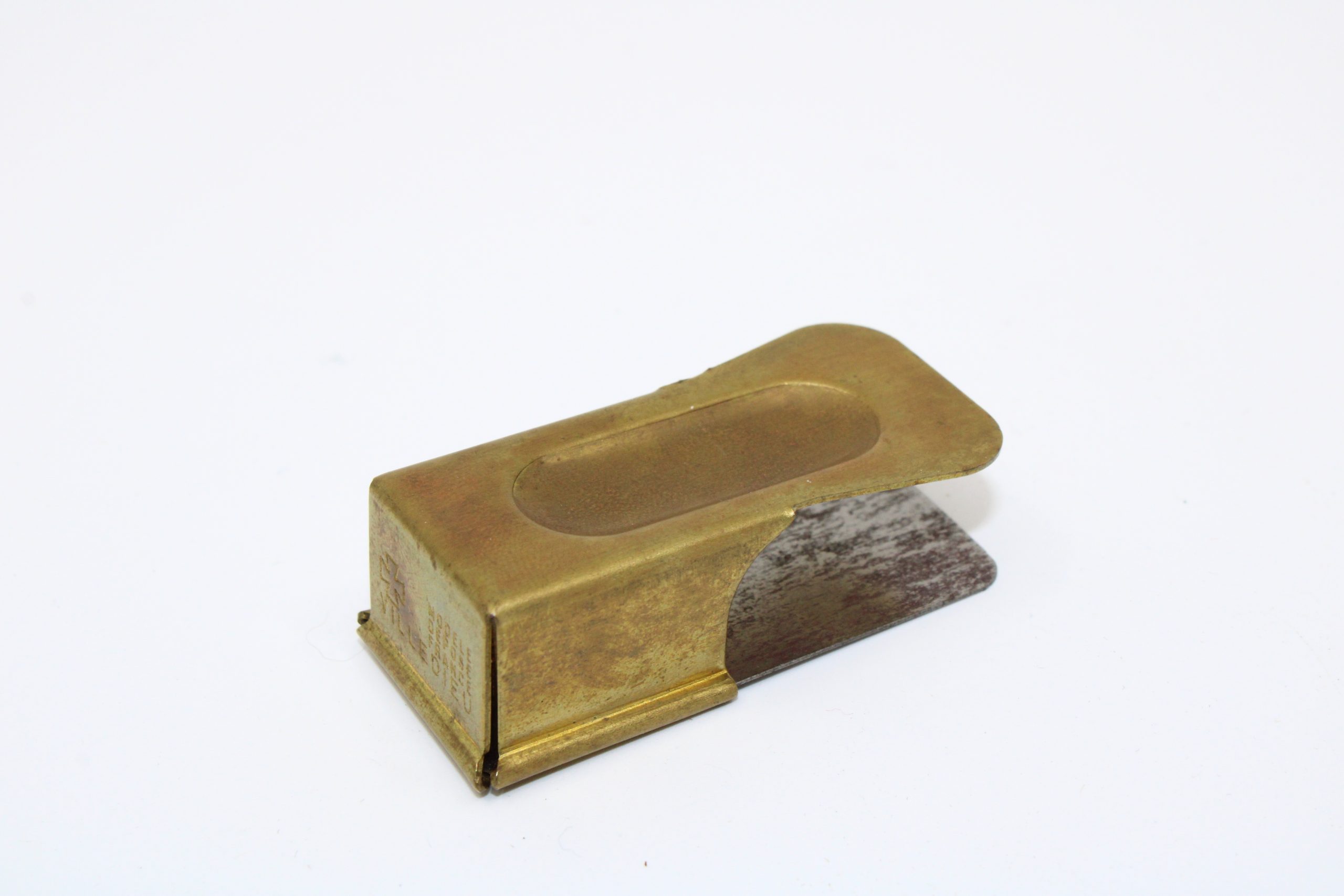 Small brass clicker, rectangular in shape, with a curved spring plate that emits a metallic “click-clack” sound when pressed. This reproduction co