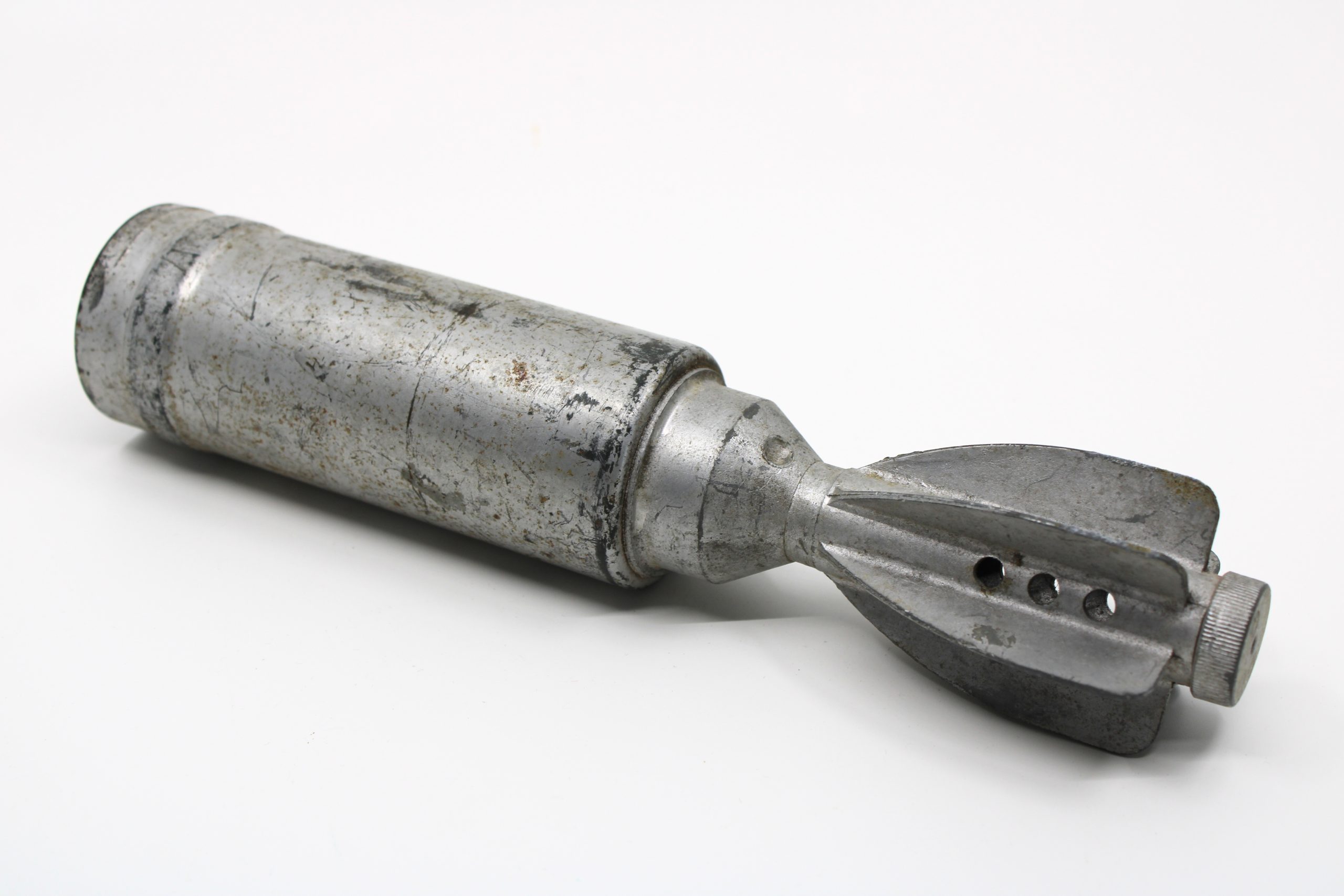 Cylindrical metal object resembling a small mortar round, with a tapered body and finned tail section featuring a central hole. The piece is completel