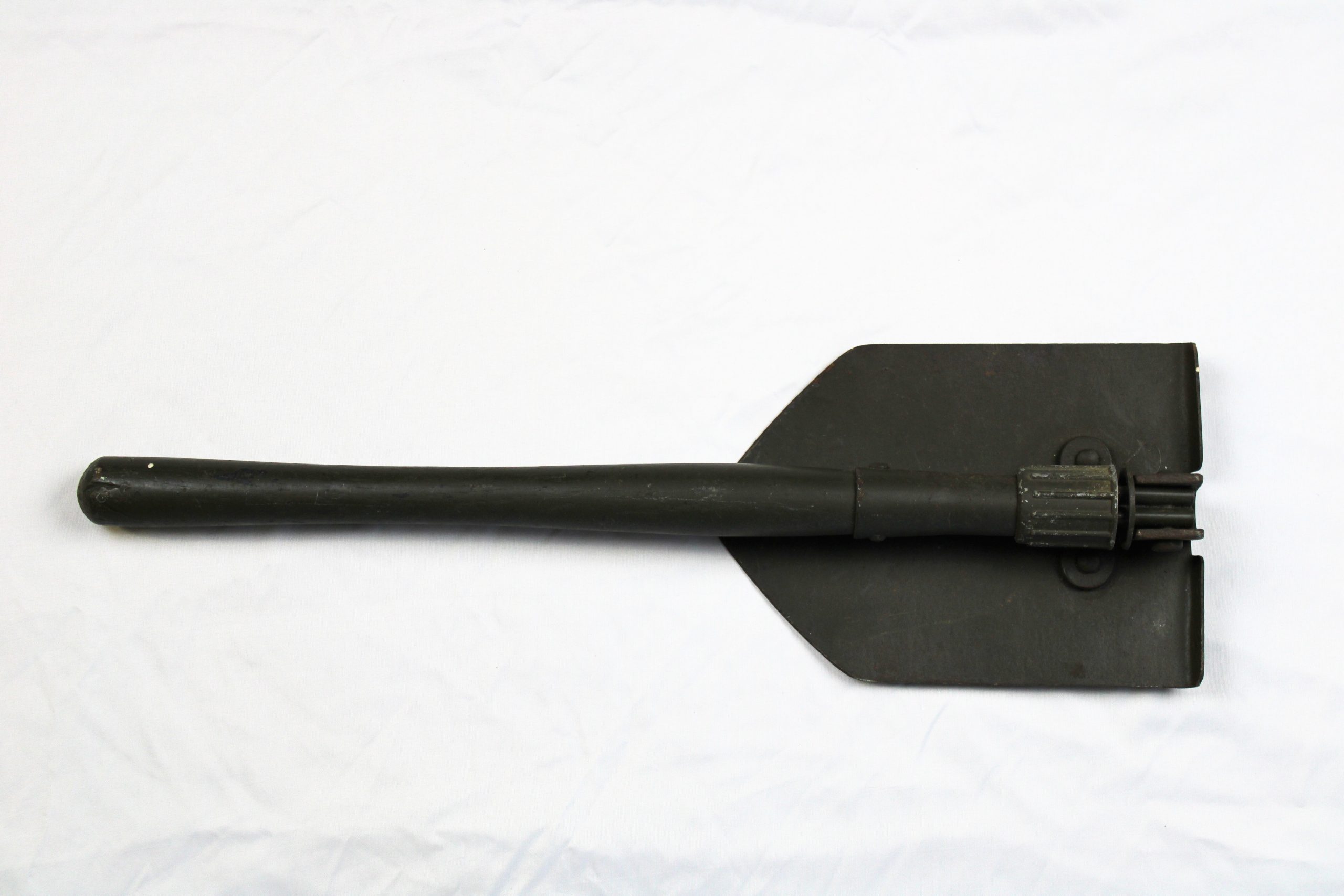 Compact folding military entrenching tool consisting of a metal spade head attached to a wooden handle. The blade is spade-shaped with one pointed edg
