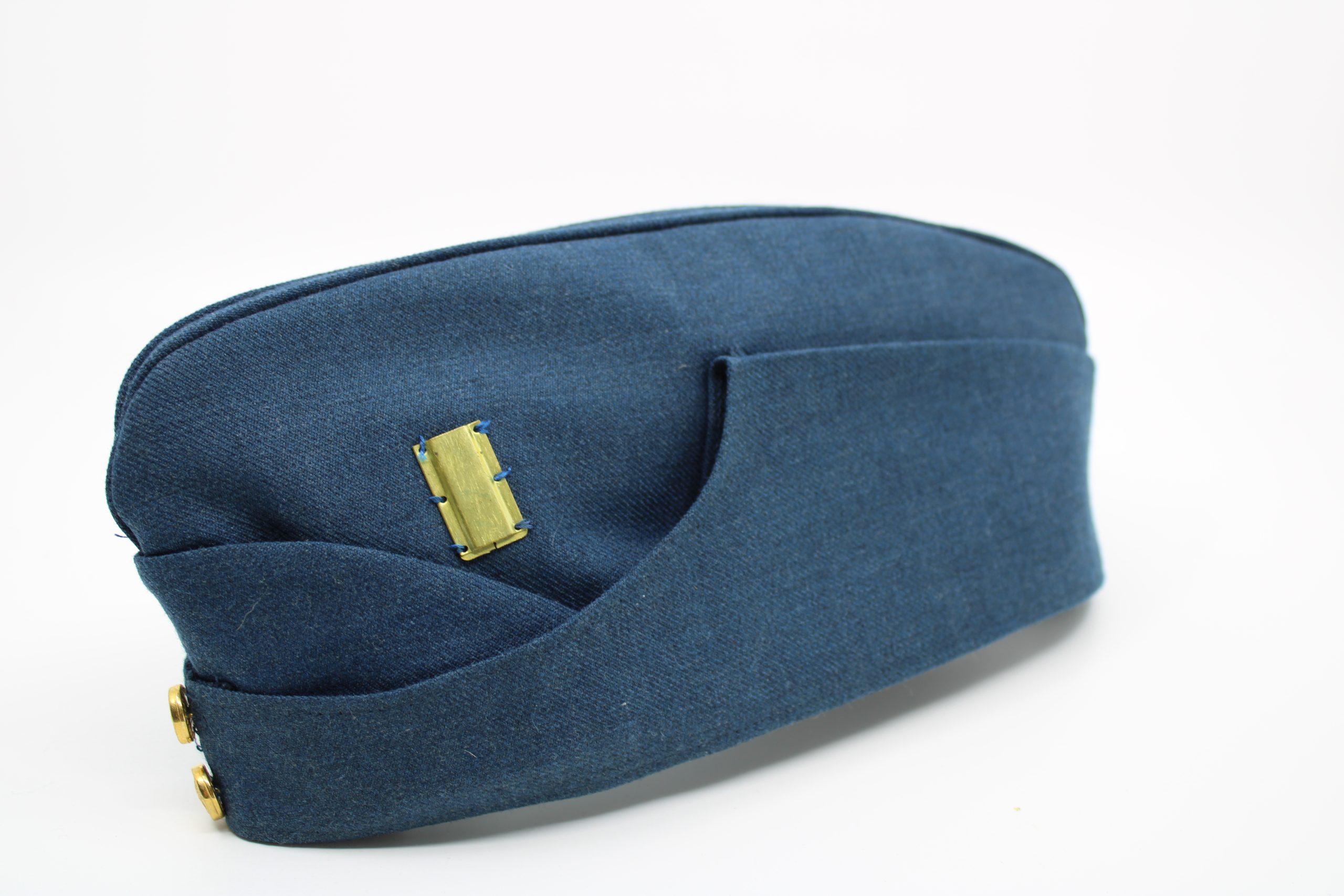 Blue wedge-style cap made of wool-polyester blend with grey inner lining. Features two gold-toned brass buttons embossed with a lion and crown insigni