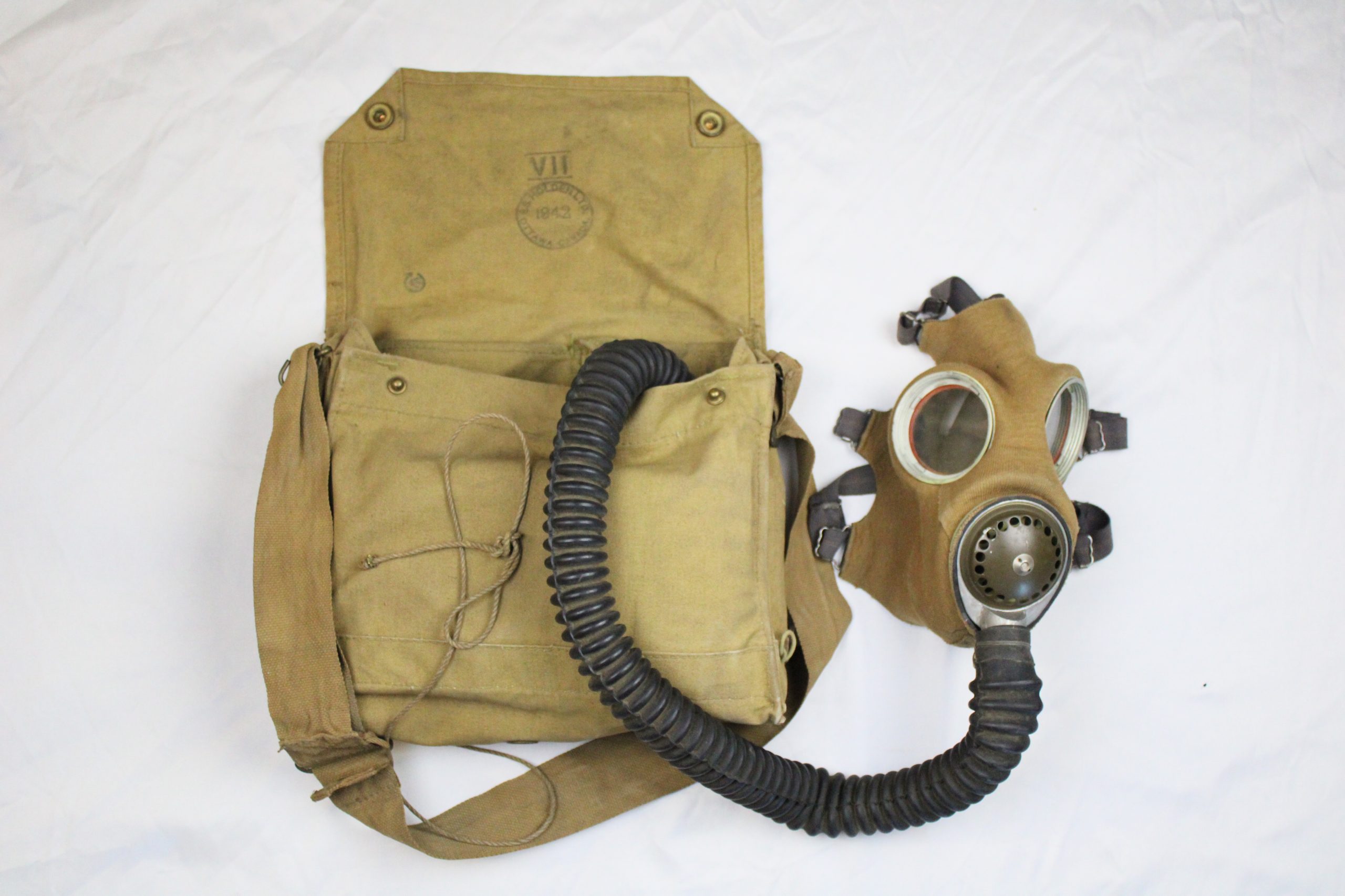 Complete gas mask set consisting of a khaki canvas carrying bag and a rubberized face mask connected by a corrugated black rubber breathing hose. The