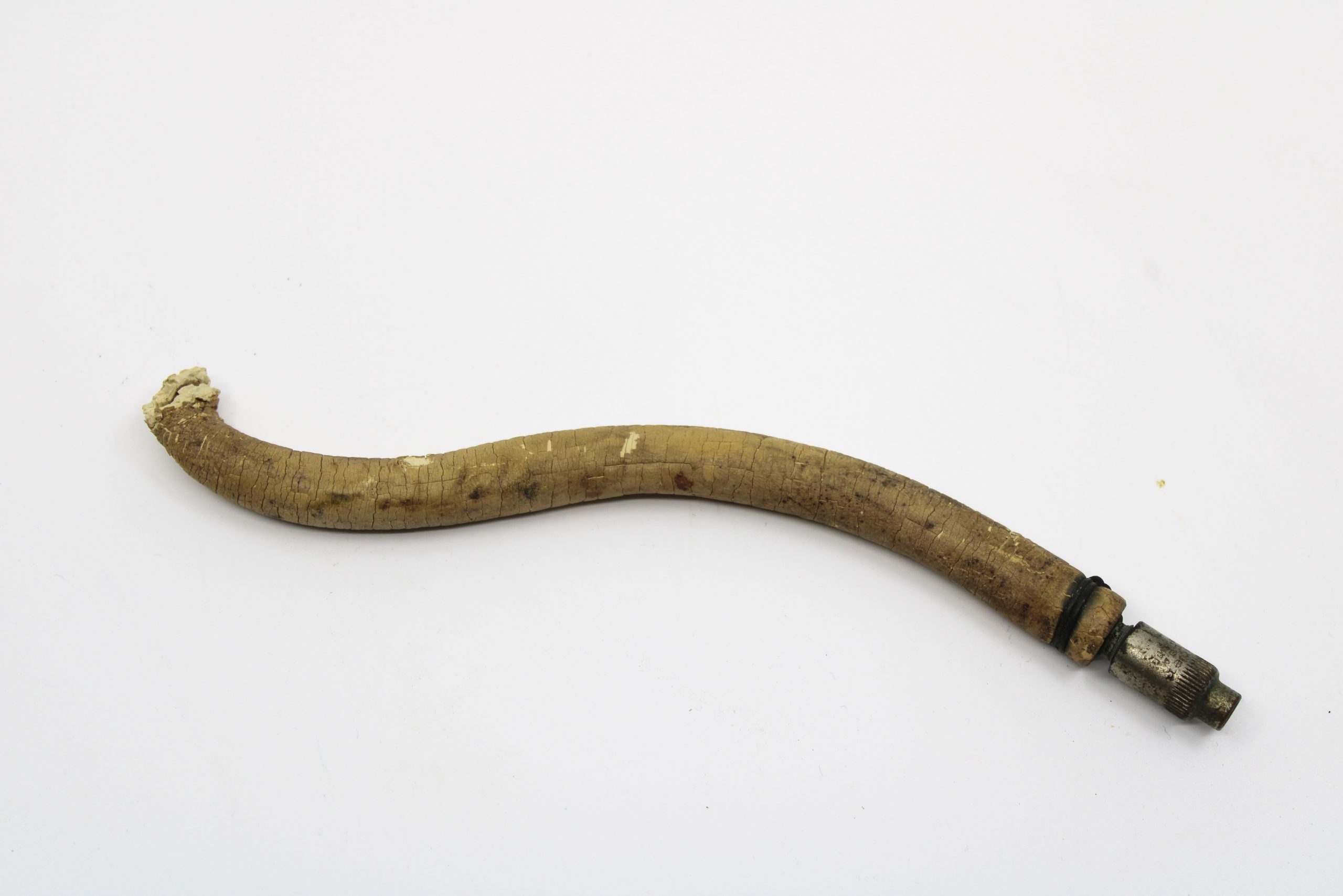 Curved breathing hose composed of hardened rubber with a metal coupling at one end, stamped with U.S. patent markings. The connection end includes a w
