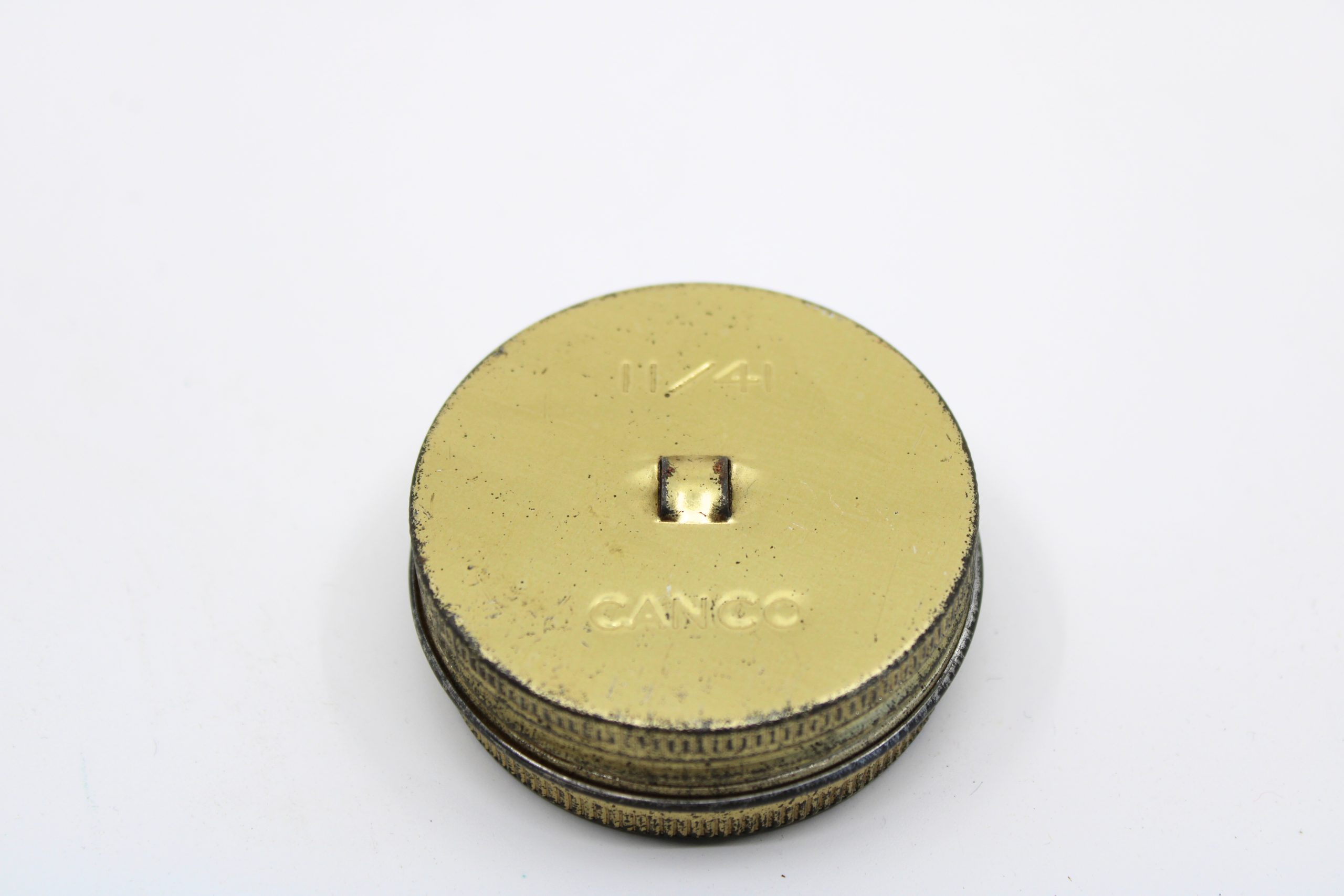 Small round metal tin painted gold, containing a treated cloth used to prevent condensation or fogging on gas mask eyepieces. The lid is printed with
