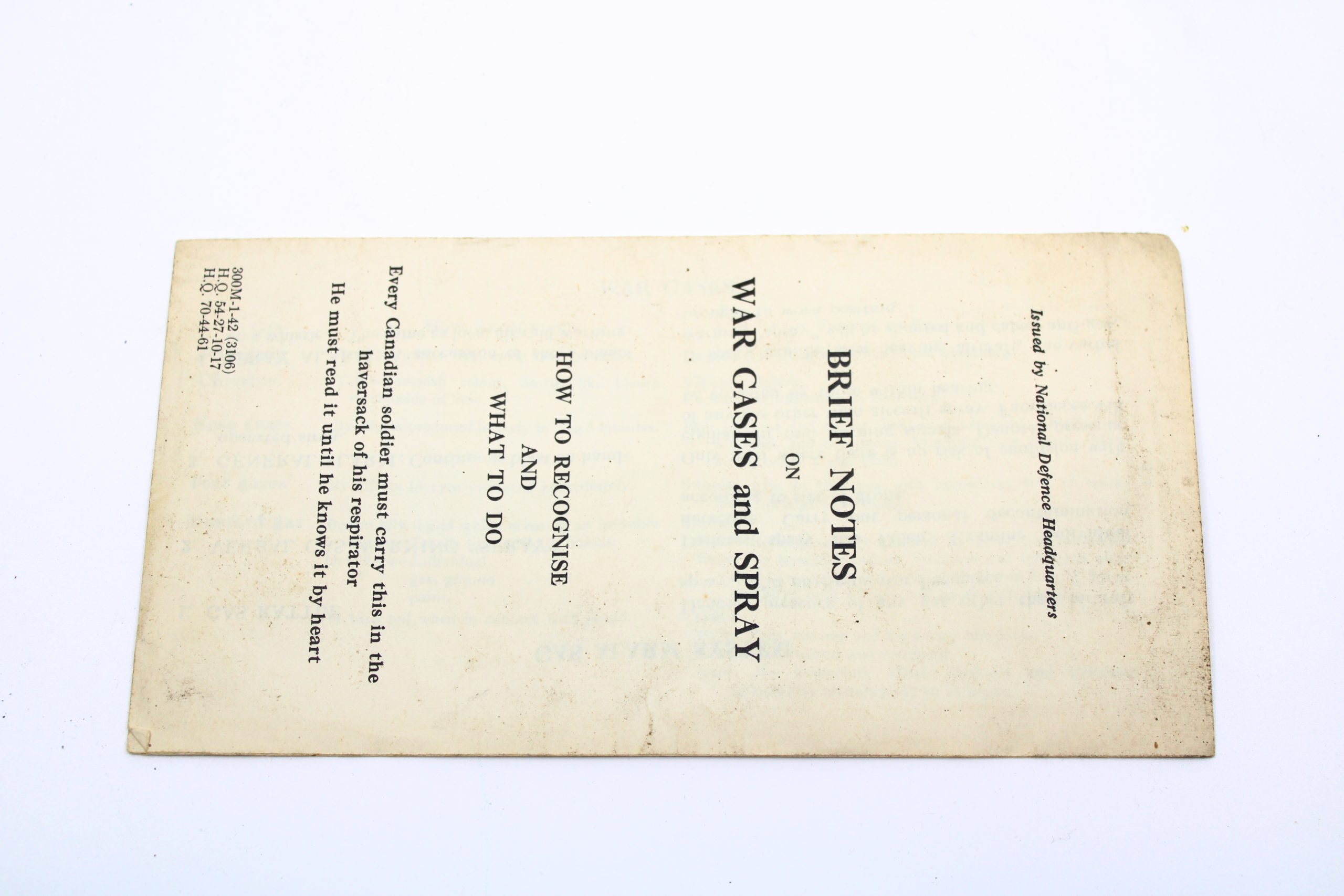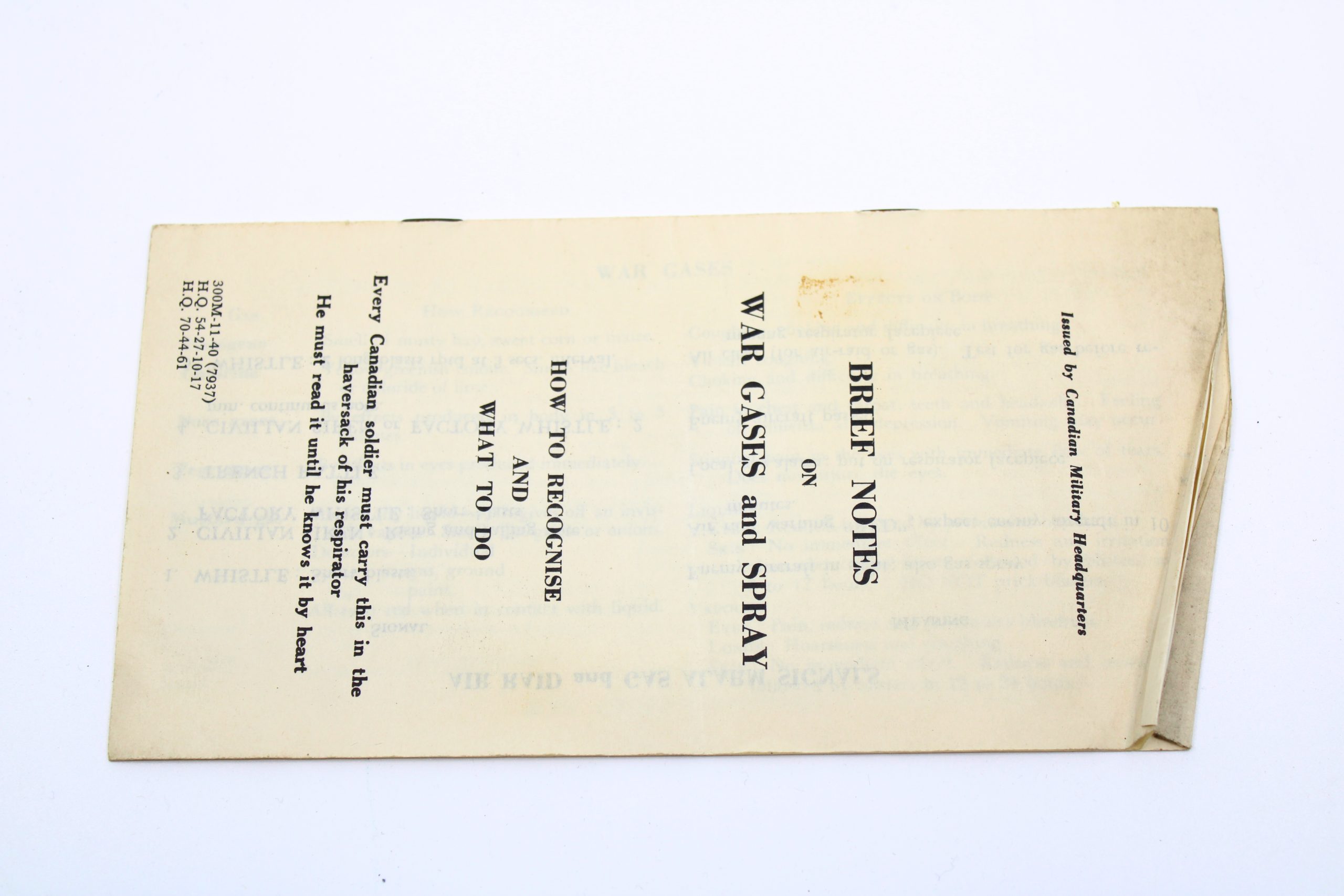 Folded paper leaflet printed on both sides, providing detailed wartime instructions for Canadian soldiers on how to identify, respond to, and treat ex