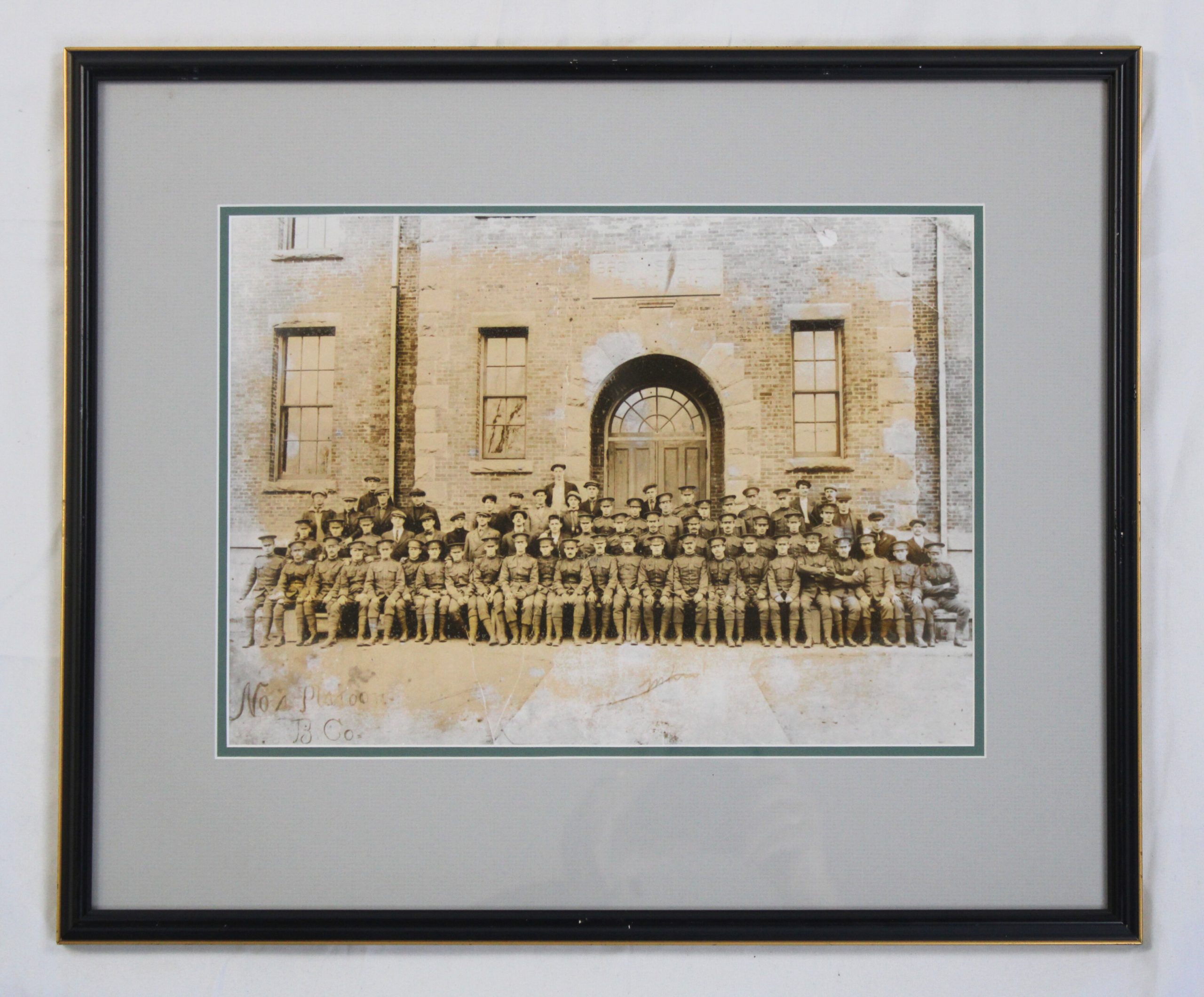 Sepia-toned photograph depicting soldiers of No. 4 Platoon, B Company posed in uniform outside a brick building with arched doorway and two large wind