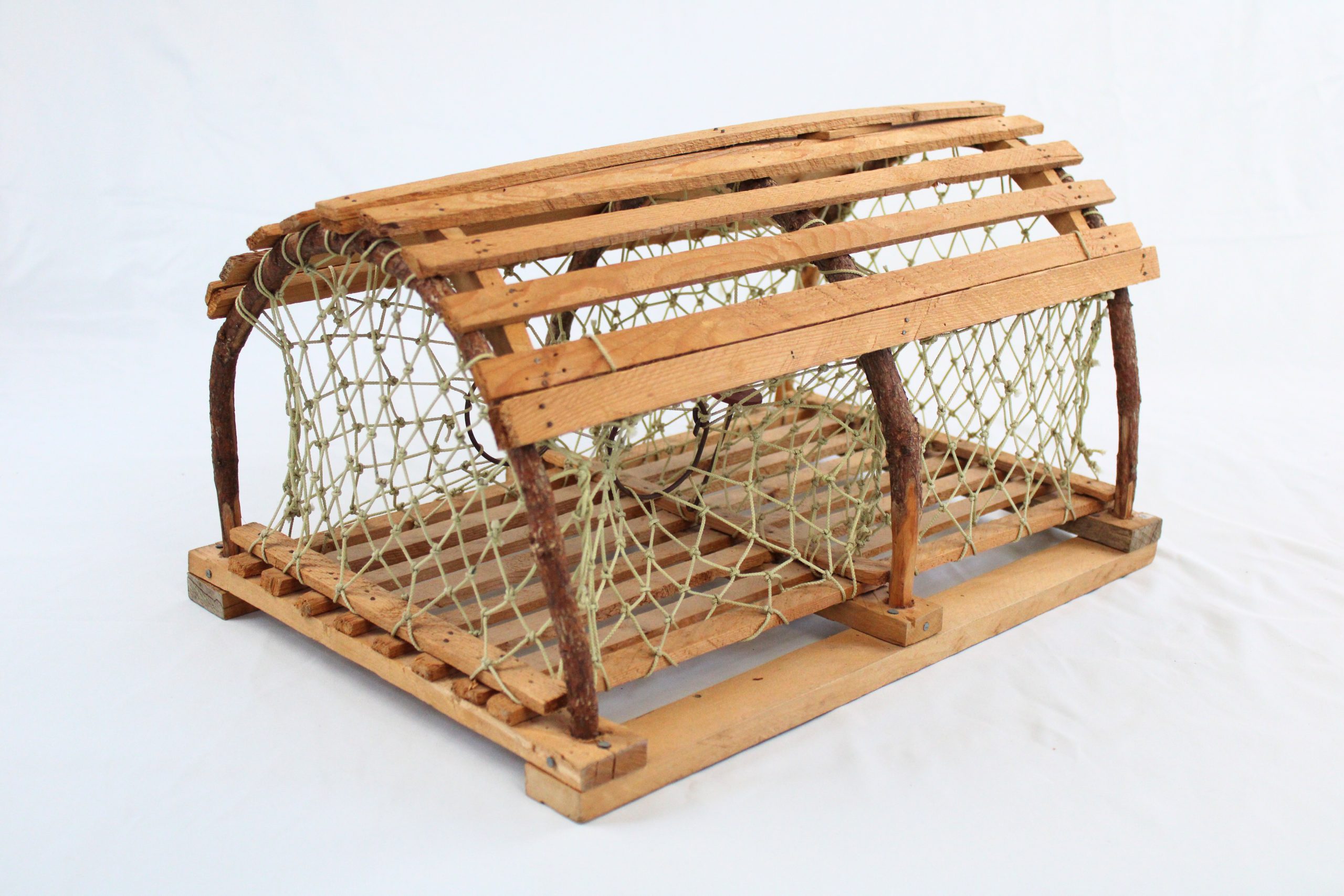A miniature model lobster trap constructed in the traditional arched “D-shape” style.