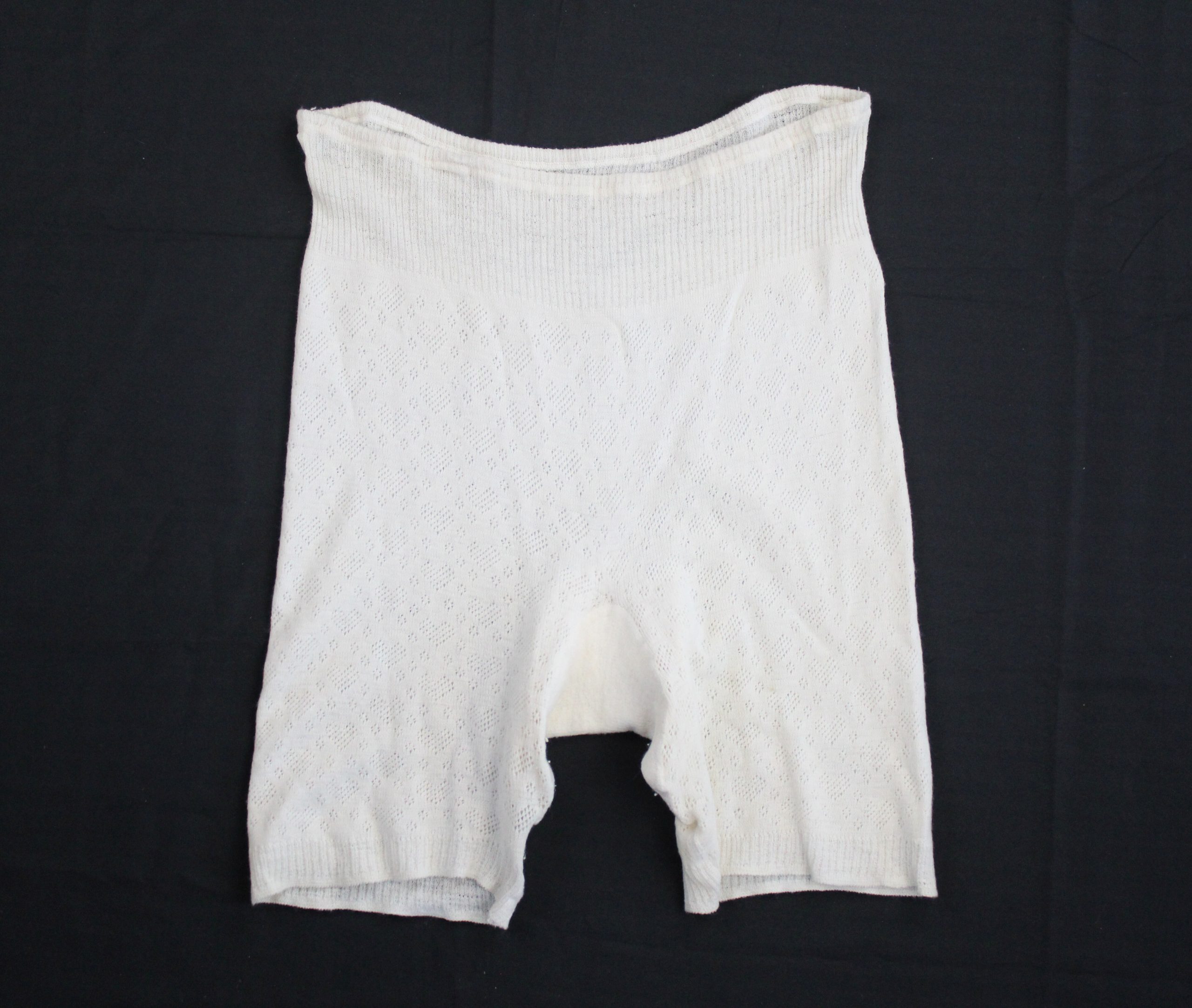 A pair of off-white, high-waisted ladies’ undergarments made from a soft knit cotton fabric. The textile features a delicate repeating heart-shaped