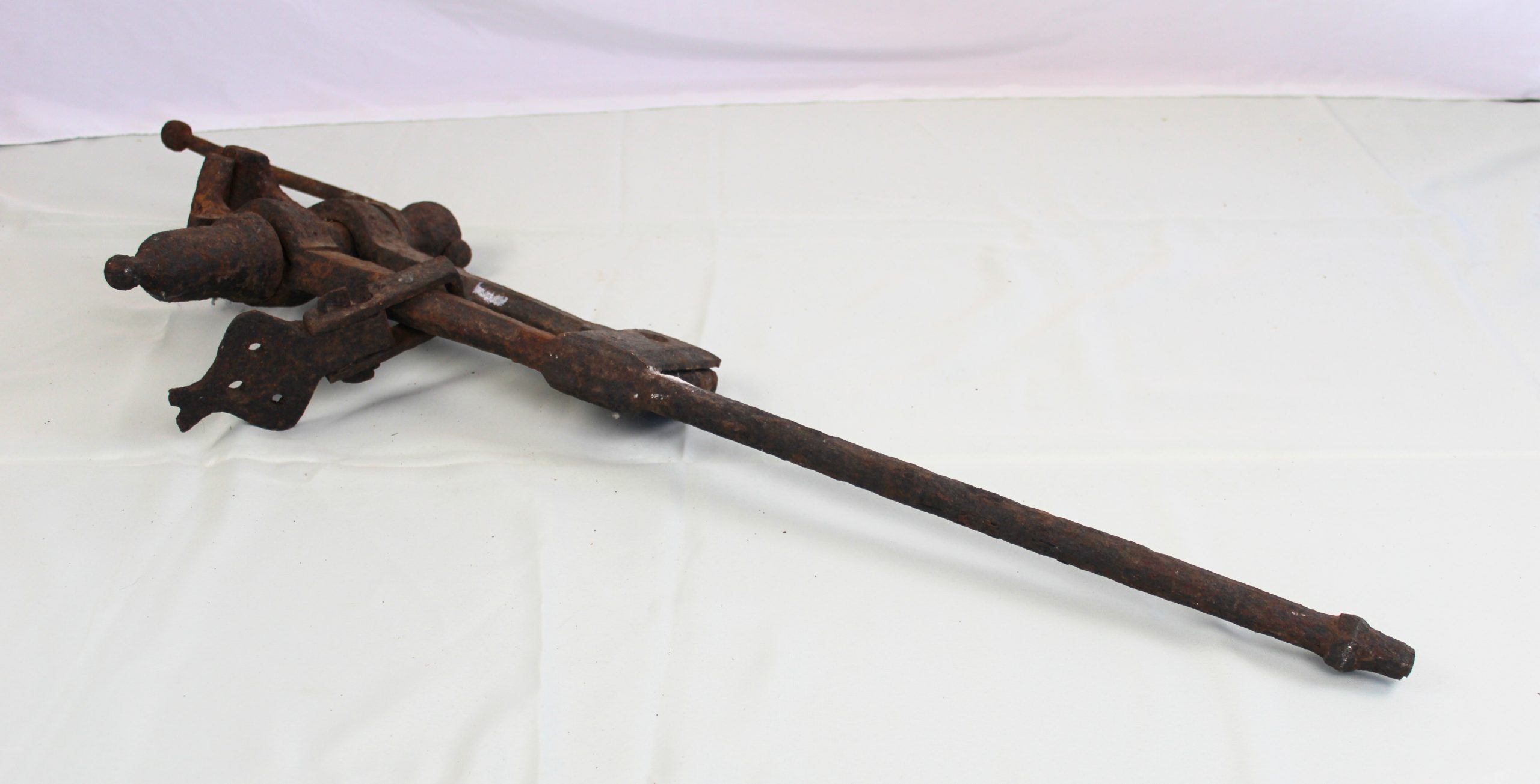 A heavy cast iron vice with a long threaded spindle and dual jaws operated by a screw mechanism. The vice is mounted on a flat metal base with bolt ho