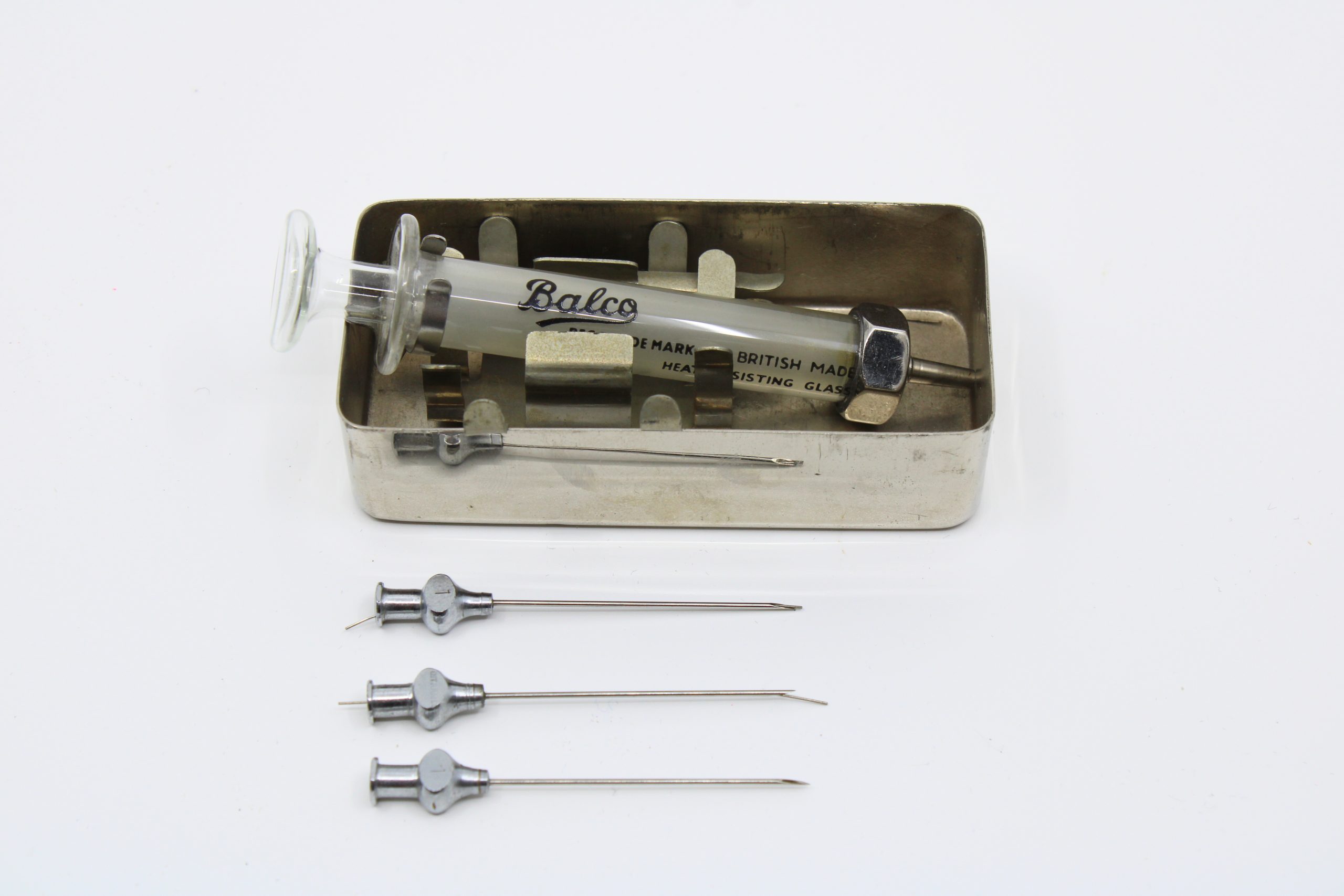 A reusable hypodermic syringe set consisting of a clear glass syringe marked “Balco – British Made Heat Resisting Glass,” a metal plunger, and f