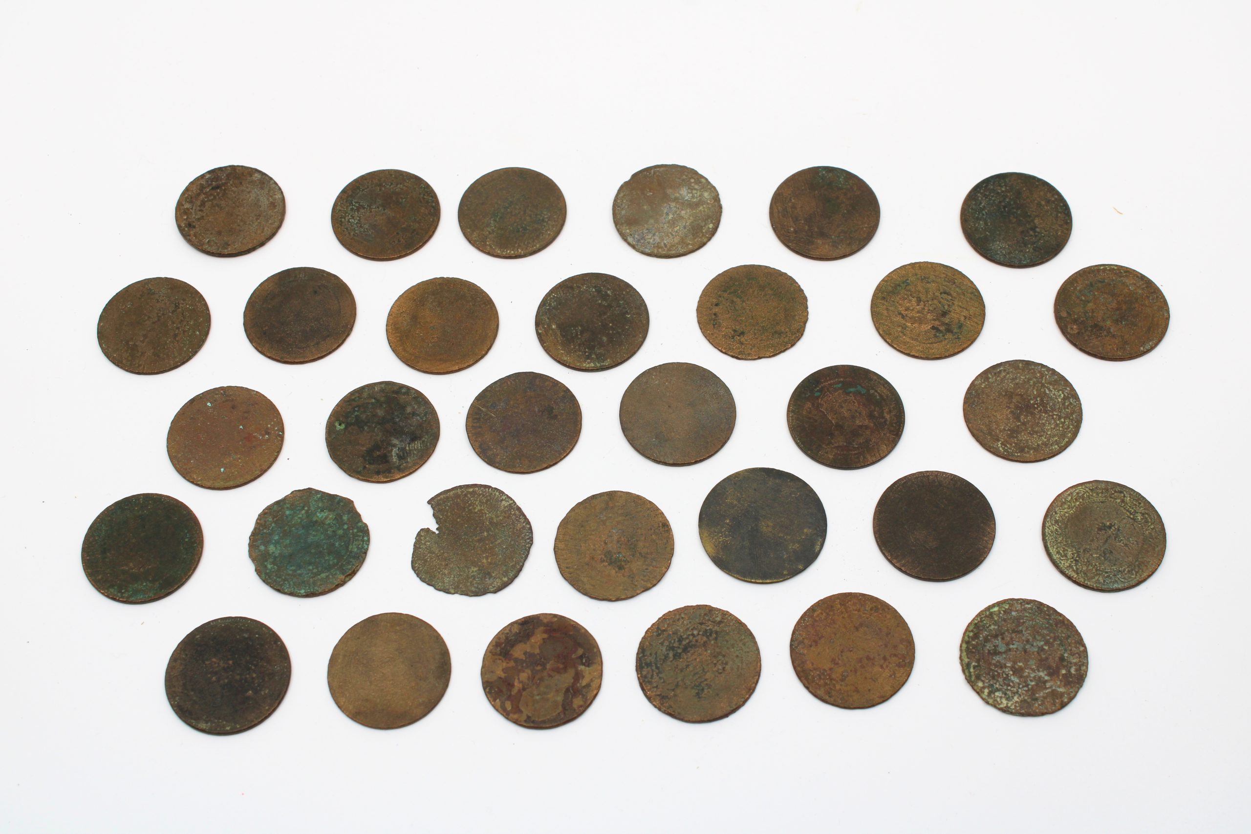 Set of 29 copper coins tokens, corroded and worn, with surfaces showing green oxidation typical of aged copper. Most inscriptions are illegible.